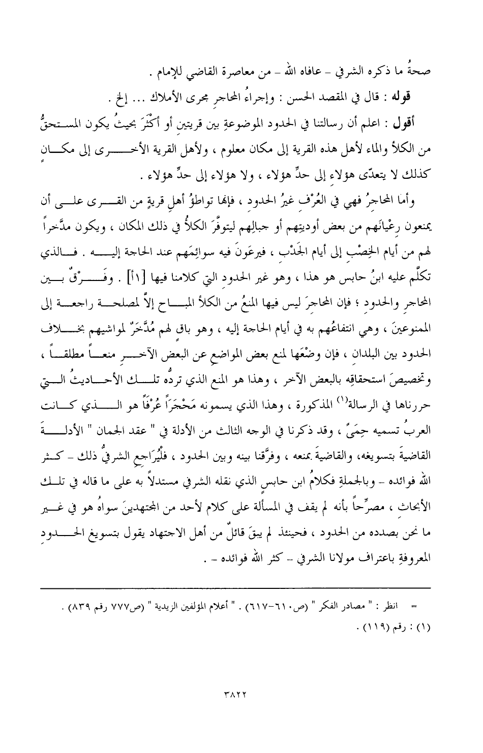 وأما المحاجرُ فهي في العُرْف غيرُ الحدودِ، فإنها تواطؤُ أهلِ قريةٍ من القرى على أن يمنعون رِعْيانَهم من بعض أوديتِهم أو جبالِهم ليتوفَّر الكلأُ في ذلك المكان، ويكون مدَّخرًا لهم من أيام الخِصْبِ إلى أيام الجَدْبِ، فيرعَونَ فيه سوائِمَهم عند الحاجة إليه. فالذي تكلَّم عليه ابنُ حابس هو هذا، وهو غير الحدودِ التي كلامنا فيها [1أ]. وفَرْقٌ بين المحاجرِ والحدودِ؛ فإن المحاجِرَ ليس فيها المنعُ من الكلأ المباح إلاَّ لمصلحة راجعة إلى الممنوعينَ، وهي انتفاعُهم به في أيام الحاجة إليه، وهو باقٍ لهم مُدَّخَرٌ لمواشيهم بخلاف الحدود بين البلدانِ، فإن وضْعَها لمنع بعض المواضعِ عن البعض الآخرِ منعًا مطلقًا، وتخصيصَ استحقاقِه بالبعض الآخر، وهذا هو المنع الذي تردُّه تلك الأحاديث التي حررناها في الرسالة (¬1) المذكورة، وهذا الذي يسمونه مَحْجَرًا عُرْفًا هو الذي كانت العربُ تسميه حِمًى، وقد ذكرنا في الوجه الثالث من الأدلة في "عقد الجمان" الأدلةَ القاضية بتسويغه، والقاضيةَ بمنعه، وفرَّقنا بينه وبين الحدود، فلْيُرَاجِعِ الشرفيُّ ذلك ـ كثر الله فوائده ـ وبالجملةِ فكلامُ ابن حابسٍ الذي نقله الشرفي مستدلاً به على ما قاله في تلك الأبحاثِ، مصرِّحًا بأنه لم يقف في المسألة على كلام لأحد من المجتهدينَ سواهُ هو في غير ما نحن بصدده من الحدود، فحينئذ لم يبقَ قائلٌ من أهل الاجتهاد يقول بتسويغ الحدودِ المعروفةِ باعتراف مولانا الشرفي ـ كثر الله فوائده.