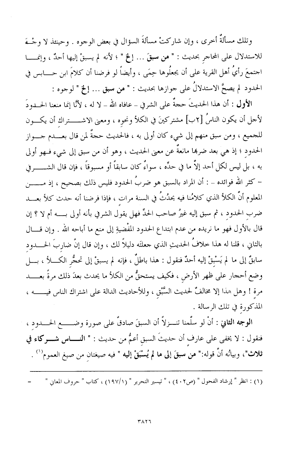 الأول: أن هذا الحديث حجة على الشرفي ـ عافاه الله ـ لا له، لأنَّا إنما منعنا الحدود لأجل أن يكون الناس [2ب] مشتركين في الكلأ ونحوِه، ومعنى الاشتراك أن يكون للجميع، ومن سبق منهم إلى شيء كان أولى به، فالحديث حجةٌ لمن قال بعدم جواز الحدود؛ إذ هي بعد ضربها مانعة عن معنى الحديث، وهو أن من سبق إلى شيء فهو أولى به، بل ليس لكل أحد إلاَّ ما في حدِّه، سواءٌ كان سابقًا أو مسبوقًا، فإن قال الشرفي ـ كثر الله فوائده ـ: أن المراد بالسبق هو ضرب الحدود فليس ذلك بصحيح، إذ من المعلوم أنَّ الكلأ الذي كلامُنا فيه يحدُثُ في السنة مراتٍ، فإذا فرضنا أنه حدث كلأ بعد ضرب الحدو، ثم سبق إليه كلامُنا فيه يحدُثُ في السنة مراتٍ، فإذا فرضنا أنه حدث كلأ بعد ضرب الحدود، ثم سبق إليه غيرُ صاحب الحدِّ فهل يقول الشرفي بأنه أولى به أم لا؟ إن قال بالأول فهو ما نريده من عدم ابتداع الحدود المفْضيةِ إلى منع ما أباحه الله. وإن قال بالثاني، قلنا له هذا خلافُ الحديث الذي جعلتَه دليلا لك، وإن قال إنَّ ضارِبَ الحدود سابقٌ إلى ما لم يَسْبِق إليه أحدٌ فنقول: هذا باطلٌ، فإنه لم يسبق إلى تحجُّر الكلأ، بل وضع أحجار على ظهر الأرض، فكيف يستحقُّ من الكلأ ما يحدث بعدَ ذلك مرةً بعد مرةٍ! وهل هذا إلا مخالفٌ لحديث السَّبْقِ، وللأحاديث الدالة على اشتراك الناس فيه، المذكورة في تلك الرسالة.
