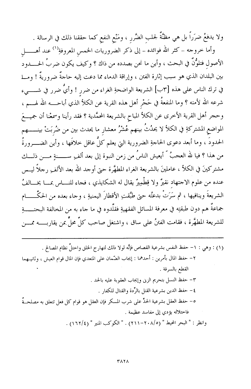 وأما خروجه ـ كثر الله فوائده ـ إلى ذكر الضروريات الخسم المعروفة (¬1) عند أهل الأصول فتلوُّنٌ في البحث، وأين ما نحن بصدده من ذاك؟ وكيف يكون ضربُ الحدود بين البلدان الذي هو سبب إثارة الفتن، وإراقة الدماء مما دعت إليه حاجةٌ ضروريةٌ! وما في ترك الناس على هذه [3ب] الشريعة الواضحةِ الغراء من ضررٍ! وأيُّ ضرر في شيء شرعه الله لأمته؟ وما املنفعةُ في حَجْرِ أهل هذه القرية عن الكلأ الذي أباحه الله لهم، وحجر أهل القرية الأخرى عن الكلأ المباح بالشريعة المحمَّدية؟ فقد رأينا وسمعْنا أن جميعَ المواضع المشتركة في الكلأ لا يحدُثُ بينهم عُشْرُ معشار ما يحدث بين من ضُرِبَتْ بينهم الحدود، وما أبعد دعوى الحاجة الضرورية التي يعلم كلُّ عاقل خلافَها، وأين الضرورةُ من هذا؟ فيا لله العجبُ أيعيش الناسُ من زمن النبوة إلى بعد ألفِ سنةٍ من ذلك مشتركينَ في الكلأ، عاملينَ بالشريعة الغراء المطهَّرة حتى أوجد الله بعد الألف رجلاً ليس عنده من علوم الاجتهاد نقيرٌ ولا قِطْميرٌ يقال له الشكايذي، فجاء للناس بما يخالفُ الشريعةَ وينافيها، ثم سَرَتْ بدعتُه حتى طبَّقتِ الأقطار اليمنية، وجاء بعده من الحكَّام جماعةٌ هم دون طبقتِه في معرفة المسائل الفقهيةِ فقلَّدوه في ما جاء به من المخالفة البحتةِ للشريعة المطهَّرة، فقامت الفتنُ على ساق، واشتغل صاحب كلِّ محلٍّ بمن يقاربه ممن