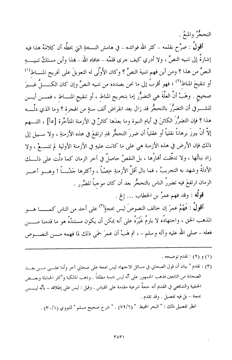 أقولُ: صرَّح بقلمه ـ كثر الله فوائده ـ في هامش النسخة التي بخطِّه أن كلامَه هذا فيه إشارةٌ إلى تنبيه النصِّ، ولا أدري كيف جرى قلمُه ـ عافاه الله ـ بهذا واين مسلكُ تنبيه النصِّ من هذا؟ ومن أين فهم تنبيهَ النصِّ؟ وكان الأَوْلَى له التعويلَ على تخريج المناط (¬1) أو تنقيحَ المناط (¬2)؛ فهو أقربُ إلى ما نحن بصدده من تنبيه النصِّ وإن كان الكلُّ غيرَ صحيحٍ. وهَبْ أنَّ العلَّة هي التضرُّر إما بتخريج المناط، أو تنقيح المناط، فمن أين للشرفي أن التضرُّر بالتحجُّر قد زال بعد انقراض ألف سنةٍ من الهجرة؟ وما الذي دلَّه هذا؟ فإن التضرُّر الكائن في أيام النبوة وما بعدَها كائنٌ في الأزمنة المتأخرة [5أ]، اللهم إلاَّ أنْ يبرزَ برهانًا نقليًا أو عقليًا أن ضرر التحجُّر قد ارتفعَ في هذه الأزمنة، ولا سبيل إلى ذلك فإن الأرض في هذه الأزمنة هي على ما كانت عليه في الأزمنة الأولية لم تتسعْ، ولا زاد نباتُها، ولا تدفَّقت أنهارُها، بل النقصُ حاصلٌ في آخر الزمان كما دلّت على ذلك الأدلةُ وشهد به التجريبُ، فما بال أقلّ الأزمنةِ خِصْبًا، وأكثرها جَدْبًا! وهو آخر الزمان ارتفعَ فيه تضر الناس بالتحجُّر بعد أن كان موجِبًا للضَّرر.