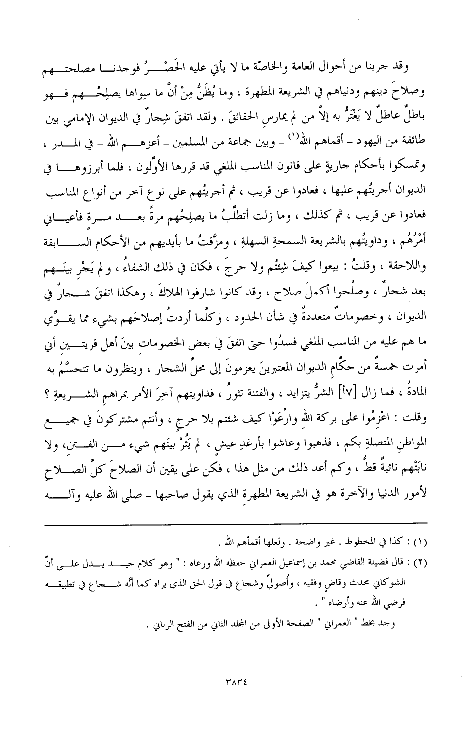 وقد جربنا من أحوال العامة والخاصّة ما لا يأتي عليه الحصْر فوجدنا مصلحتهم وصلاحَ دينهم ودنياهم في الشريعة المطهرة، وما يُظَنُّ مِنْ أنَّ سِواها يُصلِحُهم فهو باطلٌ عاطلٌ لا يَغْتَرُّ به إلاَّ من لم يمارِس الحقائقَ. ولقد اتفقَ شِجارٌ في الديوان الإمامي بين طائفة من اليهود ـ أقماهم الله (¬1) ـ