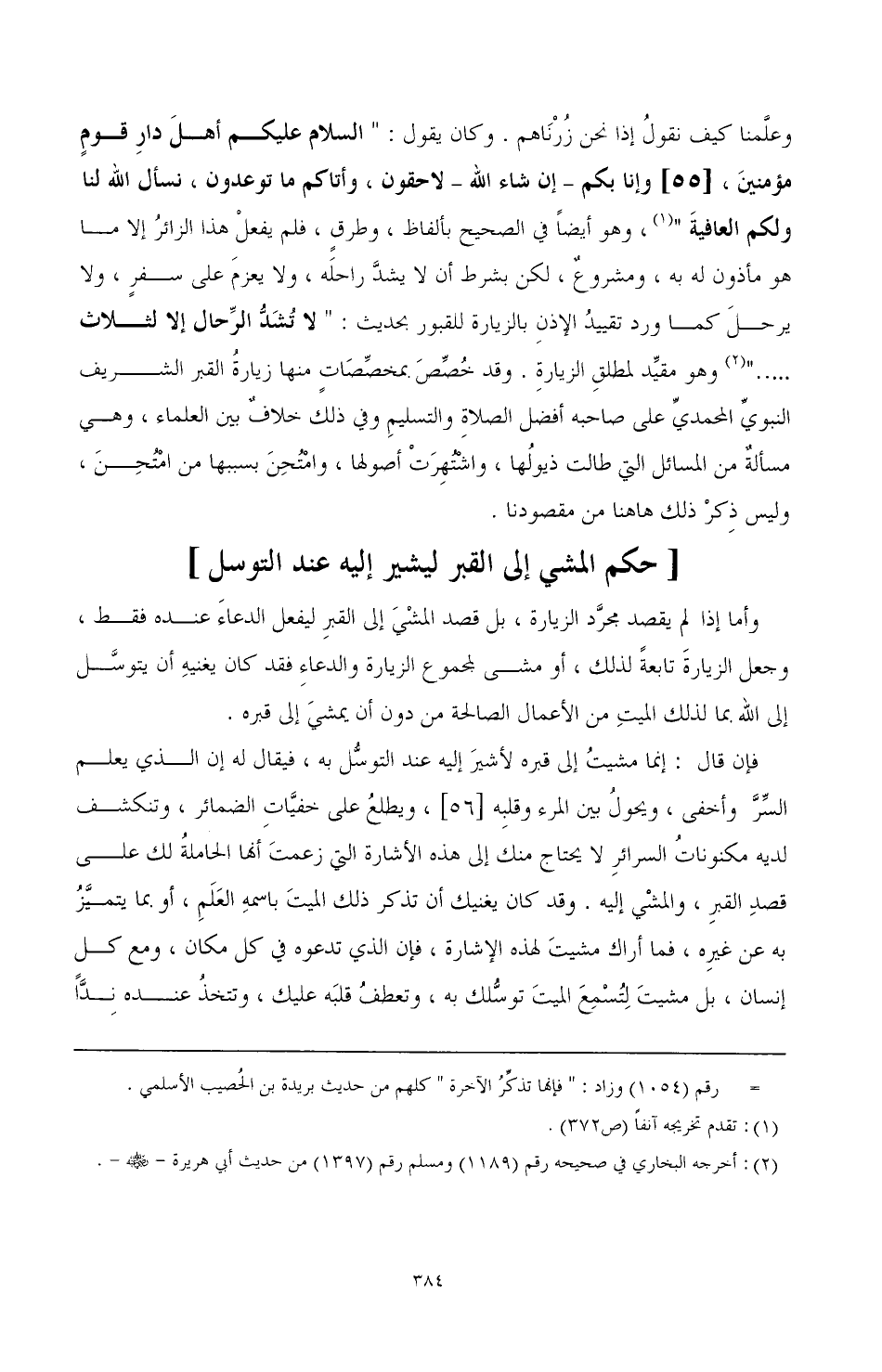 وعلمنا كيف نقول إذا نحن زرناهم. وكان يقول: " السلام عليكم أهل دار قوم مؤمنين، [55] وإنا بكم -إن شاء الله- لاحقون، وأتاكم ما توعدون، نسأل الله لنا ولكم العافية (¬1)، وهو أيضًا في الصحيح بألفاظ، وطرق، فلم يفعل هذا الزائر إلا ما هو مأذون له به، ومشروع، لكن بشرط أن لا يشد راحلة، ولا يعزم على سفر، ولا يرحل كما ورد تقييد الإذن بالزيارة للقبور بحديث: " لا تشد الرحال إلا لثلاث ... " (¬2) وهو مقيد لمطلق الزيارة. وقد خصص بمخصصات منها زيارة القبر الشريف النبوي المحمدي على صاحبه أفضل الصلاة والتسليم وفي ذلك خلاف بين العلماء، وهي مسألة من المسائل التي طالت ذيولها، واشتهرت أصولها، وامتحن بسببها من امتحن، وليس ذكر ذلك هاهنا من مقصودنا.