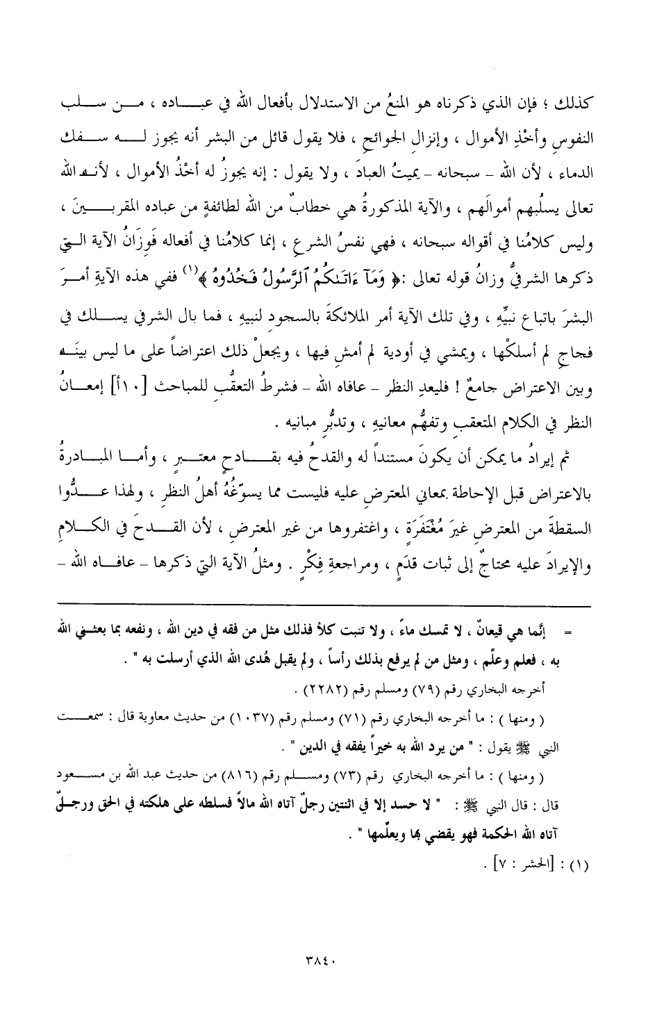 ثم إيرادُ ما يمكن أن يكونَ مستندًا له والقدحُ فيه بقادحٍ معتبرٍ، وأما المبادرةُ بالاعتراض قبل الإحاطة بمعاني المعترضِ عليه فليست مما يسوّغُهُ أهل النظرِ، ولهذا عدُّوا السقطة من المعترض غير مُغْتَفَرةٍ، واغتفروها من غير المعترض، لأن القدح في الكلام والإيراد عليه محتاجٌ إلى إثبات قدَمٍ، ومراجعةِ فكرٍ. ومثل الآية التي ذكرها ـ عافاه الله ـ
