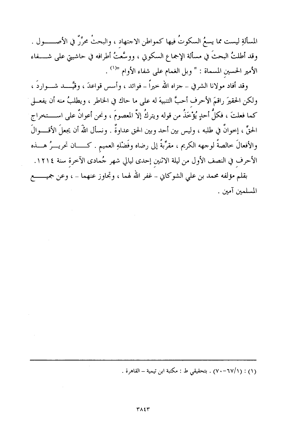 المسألةِ ليست مما يسعُ السكوتُ فيها كمواطن الاجتهادِ، والبحثُ محرِّرٌ في الأصول. وقد أطلتُ البحثَ في مسألة الإجماع السكوتي، ووسَّعتُ أطرافه في حاشيتي على شفاء الأمير الحسينِ المسماة: "وبل الغمام على شفاء الأوام" (¬1).