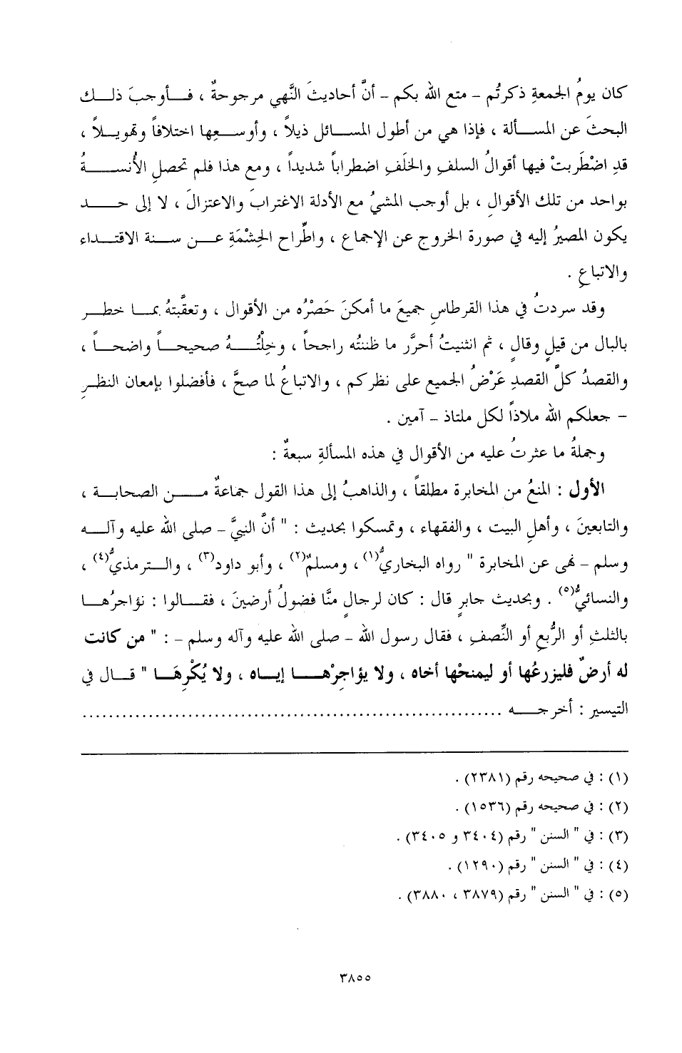 كان يومُ الجمعة ذكرتُم ـ متع الله بكم ـ أنَّ أحاديثَ النَّهي مرجوحةٌ، فأوجب ذلك البحث عن المسألة، فإذا هي أطول المسائل ذيلاً، وأوسعِها اختلافًا وتهويلاً، قدِ اضْطَربتْ فيها أقوالُ السلفِ والخلَفِ اضطرابًا شديدًا، ومع هذا فلم تحصلِ الأُنسةُ بواحدة من تلك الأقوالِ، بل أوجب المشيُ مع الأدلة الاغترابَ والاعتزالَ، لا إلى حد يكون المصيرُ إليه في صورة الخروج عن الإجماع، واطَّراح الحِشْمَةِ عن سنة الاقتداء والاتباعِ.