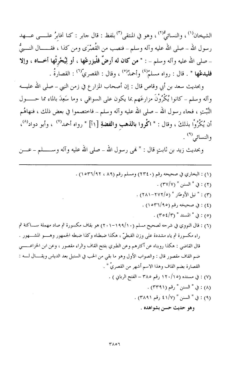 الشيخان (¬1)، والنسائيُّ (¬2)، وهو في المنتقى (¬3) بلفظ: قال جابر: كنا نخابِرُ على عهد رسول الله ـ صَلَّى اللهُ عَلَيْهِ وَآلِهِ وَسَلَّمَ ـ فنصب من القُصْرَى ومن كذا، فقال النبيُّ ـ صَلَّى اللهُ عَلَيْهِ وَآلِهِ وَسَلَّمَ ـ: "من كان له أرضٌ لفْيزرعْها، أو لِيُحْرِثها أخاه، وإلا فليدعْها". قال: رواه مسلمٌ (¬4) وأحمدُ (¬5)، وقال: القصريّ (¬6): القصارةُ.