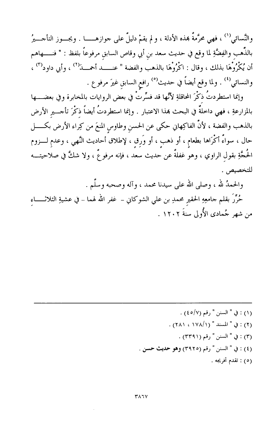 والنَّسائي (¬1)، فهي محرَّمةٌ بهذه الأدلة، ولم يقم دليلٌ على جوازها. ويجوز التأجيرُ بالذَّهب والفضة لما وقع في حديث سعد بن أبي وقاص السابق مرفوعًا بلفظ: "فنهاهم أن يُكْرُوها بذلك، وقال: اكْرُوهَا بالذهب والفضة" عند أحمد (¬2)، وأبي داود (¬3)، والنسائي (¬4). ولما وقع أيضًا في حديث (¬5) رافعٍ السابق غير مرفوع.