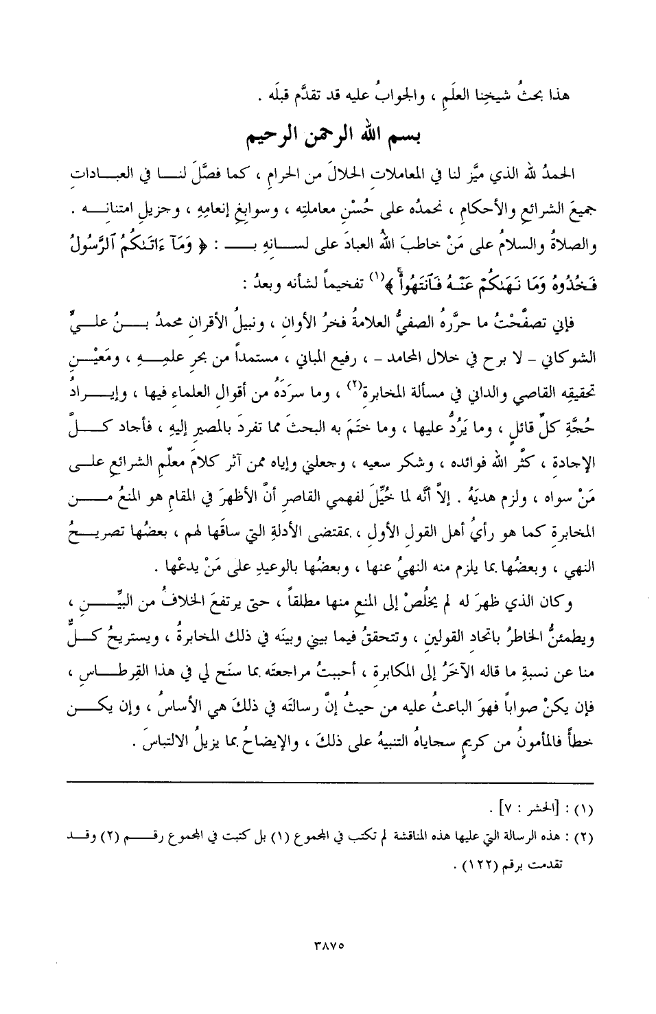(¬2) هذه الرسالة التي عليها هذه المناقشة لم تكتب في المجموع (1) بل كتبت في المجموع رقم (2) وقد تقدمت برقم (122).