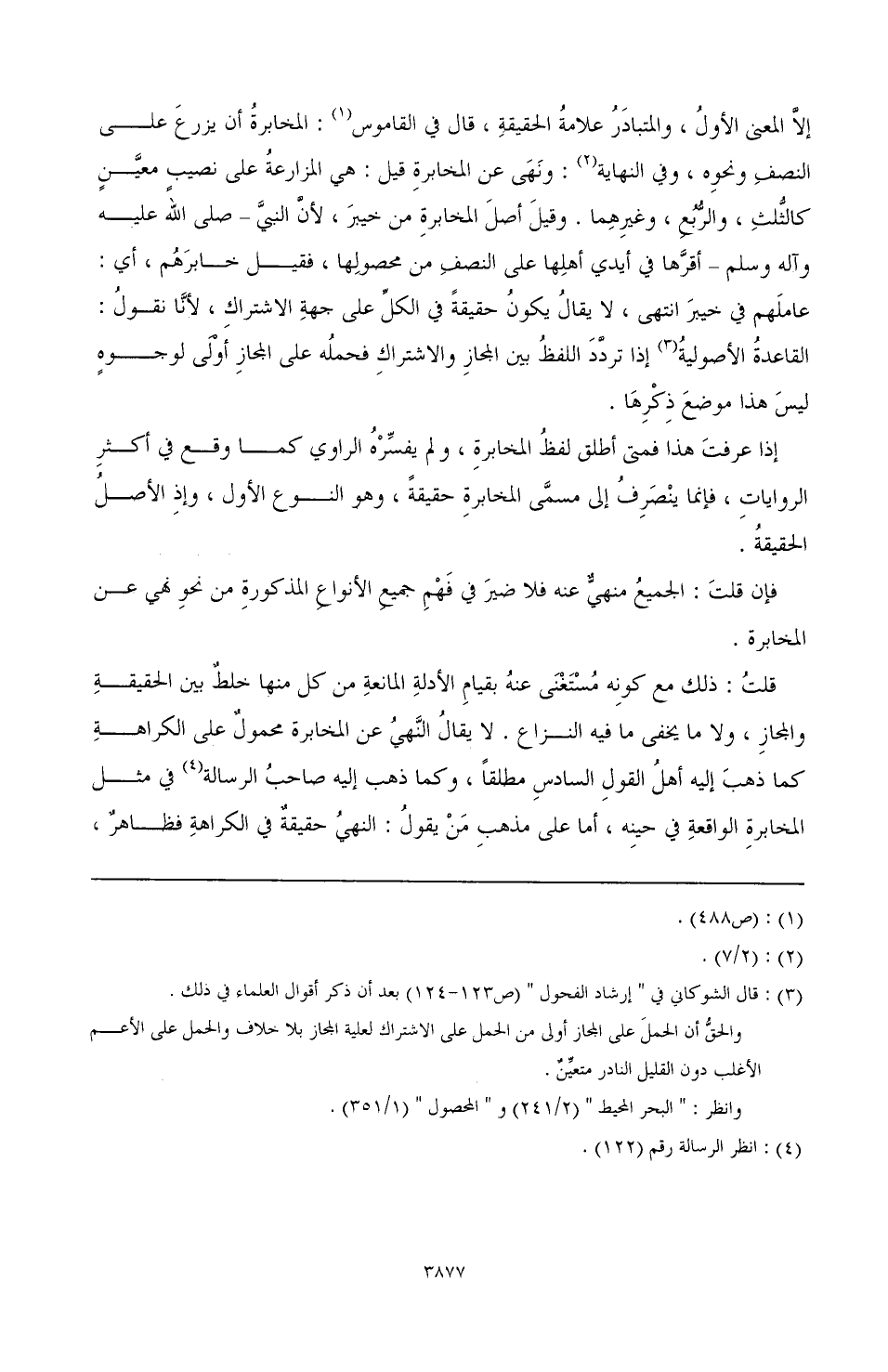 قلتُ: ذلك مع كونِه مُسْتَغْنَى عنهُ بقيامِ الأدلةِ المانعةِ من كل منها خلطٌ بين الحقيقةِ والمجازِ، ولا ما يخفى ما فيه النزاع. لا يقالُ النَّهيُ عن المخابرة محمولٌ على الكراهةِ كما ذهبَ إليه أهلُ القولِ السادسِ مطلقًا، وكما ذهب إليه صاحبُ الرسالة (¬4) في مثل المخابرةِ الواقعةِ في حينِه، أما على مذهبِ مَنْ يقولُ: النهيُ حقيقةٌ في الكراهةِ فظاهرٌ،