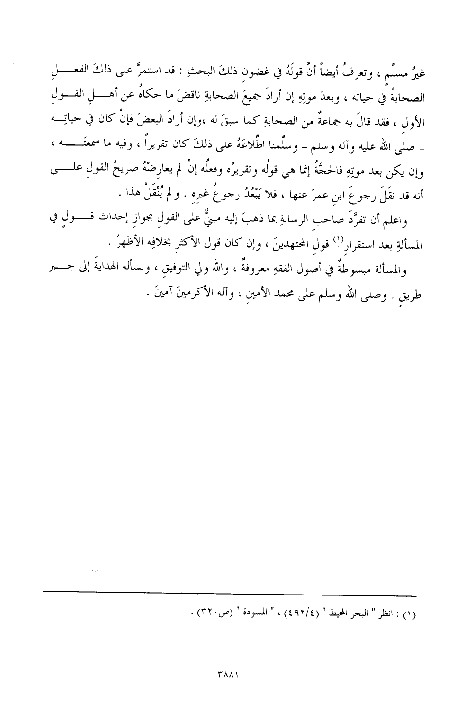 غير مسلم، وتعرف أيضًا أن قوله في غضون ذلك البحث: قد استمرّ على ذلك الفعل الصحابة في حياته، وبعد موته إن أراد جميع الصحابة ناقض ما حكاه عن أهل القول الأول، فقد قال به جماعةٌ من الصحابة كما سبق له، وإن أراد البعض فإنْ كان في حياتِه ـ صَلَّى اللهُ عَلَيْهِ وَآلِهِ وَسَلَّمَ ـ وسلّمنا اطّلاعَه على ذلك كان تقريرًا، وفيه ما سمعتَه، وإن يكن بعد موتِهِ فالحجَّةُ إنما هي قولُه وتقريرُه وفعلُه إنْ لم يعارِضْهُ صريحُ القولِ على أنه قد نقَلَ رجوعَ ابن عمرَ عنها، فلا يَبْعُدُ رجوعُ غيرِهِ. ولم يُنْقَلْ هذا.