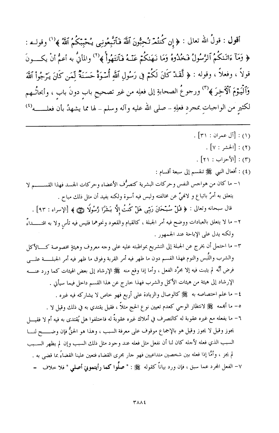 أقول: قولُ الله تعالى: {إِنْ كُنْتُمْ تُحِبُّونَ اللَّهَ فَاتَّبِعُونِي يُحْبِبْكُمُ اللَّهُ} (¬1) والمأتيُّ به أعمُّ أن يكون قولاً، وفعلاً، وقوله: {لَقَدْ كَانَ لَكُمْ فِي رَسُولِ اللَّهِ أُسْوَةٌ حَسَنَةٌ لِمَنْ كَانَ يَرْجُو اللَّهَ وَالْيَوْمَ الْآخِرَ}: [الأحزاب: 21]. (¬2): أفعال النبي صَلَّى اللهُ عَلَيْهِ وَسَلَّمَ تنقسم إلى سبعة أقسام:
