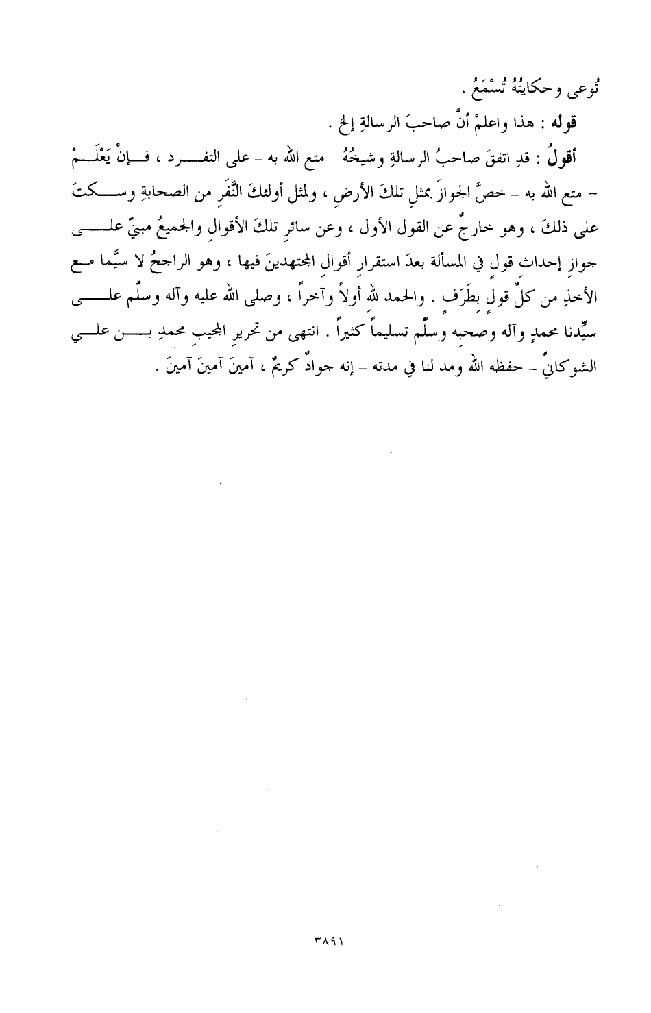 أقولُ: قدِ اتفقَ صاحبُ الرسالة وشيخُهُ ـ متع الله به ـ على التفرد، فإنْ يَعْلَمْ ـ متع الله به ـ خصَّ الجوازَ بمثلِ تلكَ الأرضِ، ولمثل أولئكَ النَّفَرِ من الصحابة وسكتَ على ذلك، وهو خارجٌ عن القول الأول، وعن سائرِ تلكَ الأقوالِ والجميعُ مبنيّ على جوازِ إحداث قولٍ في المسألة بعدَ استقرارِ أقوالِ المجتهدينَ فيها، وهو الراجحُ لا سيَّما مع الأخذِ من كلِّ قولٍِ بطَرَفٍ. والحمد لله أولا وآخرًا، وصلى الله عليه وآله وسلَّم على سيِّدنا محمدٍ وآله وصحبه وسلَّم تسليمًا كثيرًا. انتهى من تحرير المجيبِ محمد بن علي الشوكانيّ ـ حفظه الله ومد لنا في مدته ـ إنه جوادٌ كريمٌ، آمينَ آمينَ آمينَ.