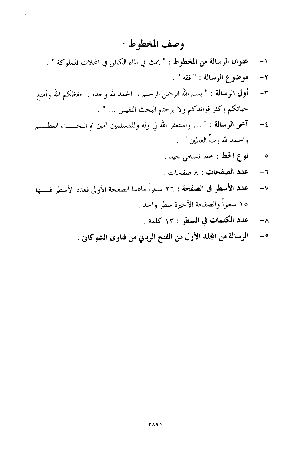1 - عنوان الرسالة من المخطوط: "بحث في الماء الكائن في المحلات المملوكة".