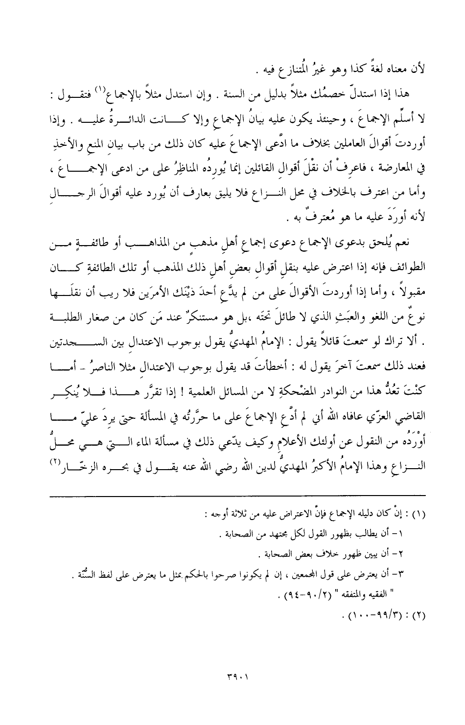 3 - أن يعترض على قول المجمعين، إن لم يكونوا صرحوا بالحكم بمثل ما يعترض على لفظ السُّنة "الفقيه والمتفقه" (2/ 90 - 94).