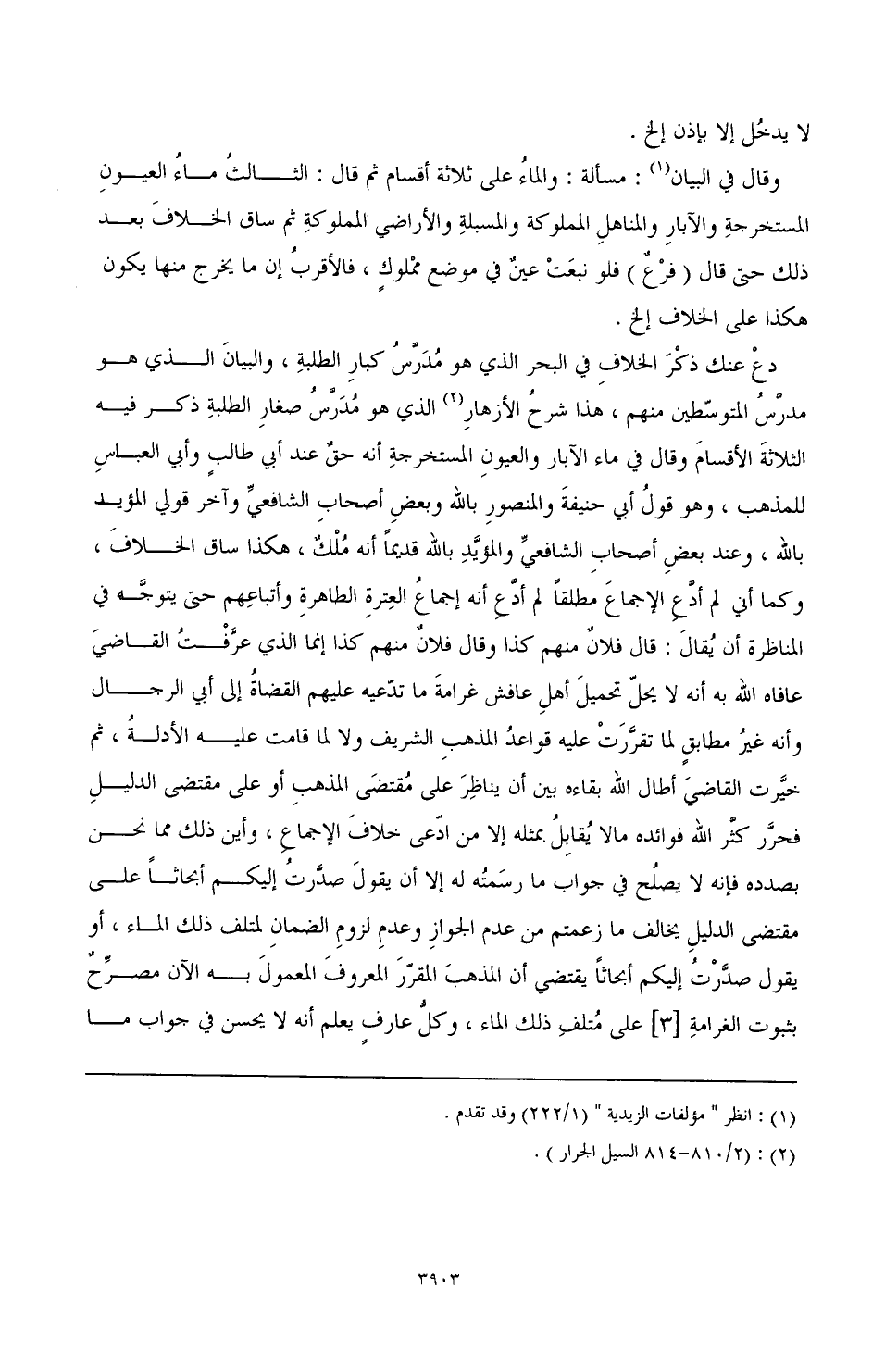 دعْ عنك ذكْرَ الخلافِ في البحر الذي هو مُدَرِّسُ كبارِ الطلبةِ، والبيانَ الذي هو مدرَّسُ المتوسّطين منهم، هذا شرحُ الأزهارِ (¬2) الذي هو مُدَرَّسُ صغارِ الطلبةِ ذكر فيه الثلاثةَ الأقسامَ وقال في ماء الآبار والعيونِ المستخرجةِ أنه حقٌّ عند أبي طالب وأبي العباس للمذهب، وهو قولُ أبي حنيفةَ والمنصورِ بالله وبعض أصحاب الشافعيِّ وآخر قولي المؤيد بالله، وعند بعضِ أصحابِ الشافعيِّ والمؤيَّدِ بالله قديمًا أنه مُلْكٌ، هكذا ساق الخلافَ، وكما أني لم أدَّعِ الإجماعَ مطلقًا لم أدَّعِ أنه إجماعُ العِترةِ الطاهرةِ وأتباعِهم حتى يتوجَّه في المناظرة أن يُقالَ: قال فلانٌ منهم كذا وقال فلانٌ منهم كذا إنما الذي عرَّفْتُ القاضيَ عافاه الله به أنه لا يحلّ تحميلَ أهلِ عافش غرامةَ ما تدّعيه عليهم القضاةُ إلى أبي الرجال وأنه غيرُ مطابقٍ لما تقرَّرَتْ عليه قواعدُ المذهبِ الشريف ولا لما قامت عليه الأدلةُ، ثم خيَّرت القاضيَ أطالا لله بقاءه بين أن يناظِرَ على مُقتضَى المذهبِ أو على مقتضى الدليل فحرَّر كثَّر الله فوائده ما لا يُقابِلُ بمثله إلا من ادّعى خلافَ الإجماعِ، وأين ذلك مما نحن بصدده فإنه لا يصلُح في جواب ما رسَمتُه له إلا أن يقولَ صدَّرتُ إليكم أبحاثًا على مقتضى الدليلِ يخالف ما زعمتم من عدم الجوازِ وعدم لزوم الضمان لمتلف ذلك الماء، أو يقول صدَّرْتُ إليكم أبحاثًا يقتضي أن المذهبَ المقرّرَ المعروفَ المعمولَ به الآن مصرِّحٌ بثبوت الغرامةِ [3] على مُتلف ذلك الماء، وكلُّ عارفٍ يعلم أنه لا يحسن في جواب ما