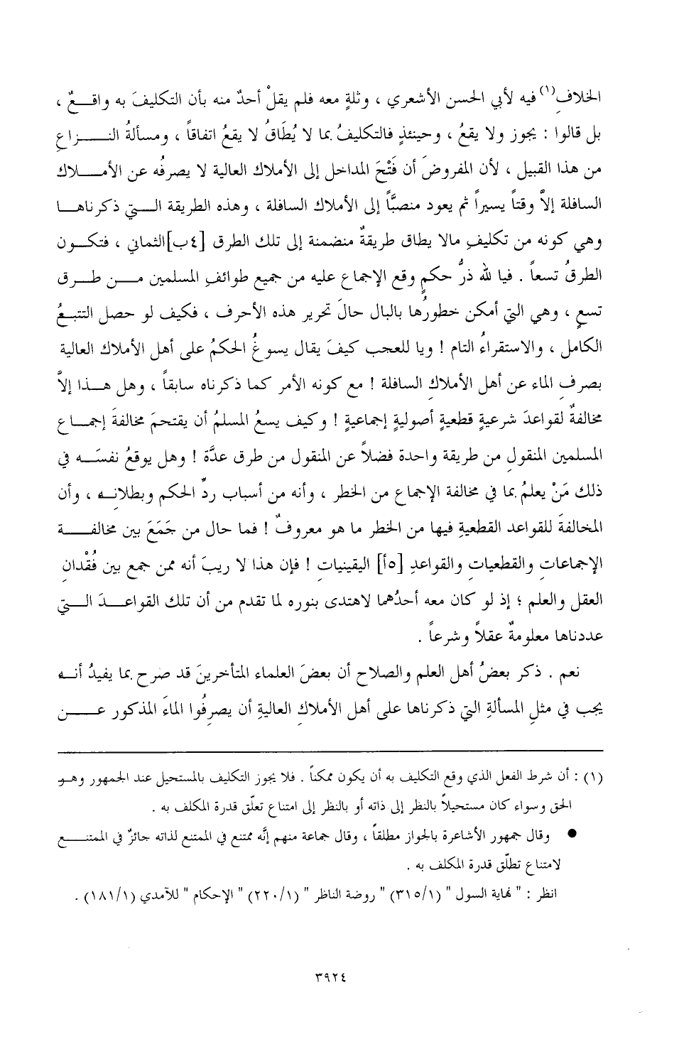 الخلاف (¬1) فيه لأبي الحسن الأشعري، وثلةٍ معه فلم يقل أحدٌ منه بأن التكليف به واقعٌ، بل قالوا: يجوز ولا يقعُ، وحينئذٍ فالتكليفُ بما لا يُطاقُ لا يقعُ اتفاقًا، ومسألة النزاع من هذا القبيل، لأن المفروضَِ أن فَتْحَ المداخل إلى الأملاك العالية لا يصرفُه عن الأملاك السافلة إلاَّ وقتًا يسيرًا ثم يعود منصبًّا إلى الأملا السافلة، وهذه الطرقة التي ذكرناها وهي كونه من تكليفِ ما لا يطاق طريقةٌ منضمة إلى تلك الطرق [4ب] الثماني، فتكون الطرقُ تسعًا. فيا لله ذرُّ حكمٍ وقع الإجماع عليه من جميع طوائف المسلمين من طرق تسعٍ، وهي التي أمكن خطورها بالبال حالَ تحرير هذه الأحرف، فكيف لو حصل التتبعُ الكامل، والاستقراءُ التام! ويا للعجب كيفَ يقال يسوغُ الحكمُ على أهل الأملاك العالية بصرف الماء عن أهل الأملاك السافلة! مع كونه الأمر كما ذكرناه سابقًا، وهل هذا إلاَّ مخالفةٌ لقواعدَ شرعيةٍ قطعيةٍ أصوليةٍ إجماعيةٍ! وكيف يسعُ المسلمُ أن يقتحمَ مخالفةَ إجماع المسلمين المنقولِ من طريقة واحدة فضلاً عن المنقول من طرق عدَّة! وهل يوقعُ نفسَه في ذلك مَنْ يعلمُ بما في مخالفة الإجماع من الخطر، وأنه من أسباب ردِّ الحكم وبطلانه، وأن المخالفةَ للقواعد القطعيةِ فيها من الخطر ما هو معروفٌ! فما حال من جَمَعَ بين مخالفة الإجماعاتِ والقطعياتِ والقواعدِ [5أ] اليقينياتِ! فإن هذا لا ريبَ أنه ممن جمع بين فُقْدانِ العقل والعلم؛ إذ لو كان معه أحدُهما لاهتدى بنوره لما تقدم من أن تلك القواعدَ التي عددناها معلومةٌ عقلاً وشرعًا.