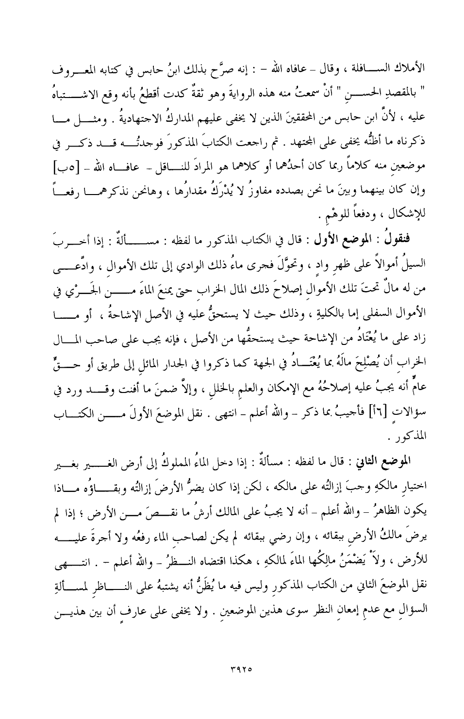 فنقولُ: الموضع الأول: قال في الكتاب المذكور ما لفظه: مسألةٌ: إذا أخربَ السيلُ أموالاً على ظهرِ وادٍ، وتحوَّلَ فجرى ماءُ ذلك الوادي إلى تلك الأموال، وادَّعى من له مالٌ تحتَ تلك الأموالِ إصلاحَ ذلك المال الخرابِ حتى يمنعَ الماءَ من الجَرْي في الأموال السفلى إما بالكليةِ، وذلك حيث لا يستحقُّ عليه في الأصل الإشاحةُ، أو ما زاد على ما يُعْتَادُ من الإشاحة حيث يستحقُّها من الأصل، فإنه يجب على صاحب المال الخرابِ أن يُصْلِحَ مالَهُ بما يُعْتَادُ في الجهة كما ذكروا في الجدار المائلِ إلى طريق أو حقّ عامّ أنه يجبُ عليه إصلاحُهُ مع الإمكان والعلم بالخلل، وإلاَّ ضمنَ ما أفنت وقد ورد في سؤالاتٍ [6أ] فأجيب بما ذكر ـ والله أعلم ـ انتهى. نقل الموضعَ الأولَ من الكتاب المذكور.