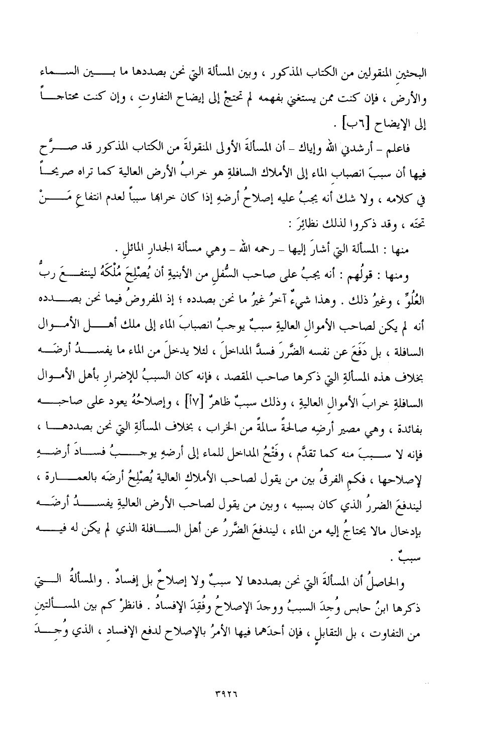 فاعلم ـ أرشدني الله وإياك ـ أن المسألةَ الأ, لى المنقولَة من الكتاب المذكور قد صرَّح فيها أن سببَ انصبابِ الماء إلى الأملاك السافلةِ هو خرابُ الأرض العالية كما تراه صريحًا في كلامه، ولا شك أنه يجبُ عليه إصلاحُ أرضِه إذا كان خرابها سببًا لعدم انتفاعِ مَنْ تحتَه، وقد ذكروا لذلك نظائِرَ:
