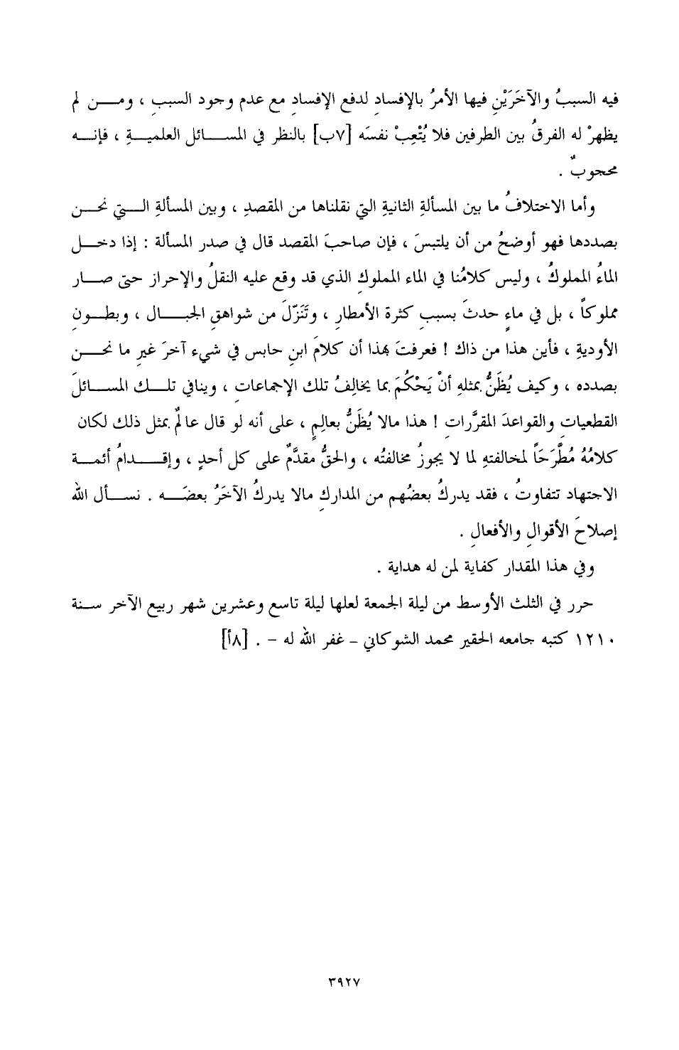 وأما الاختلافُ ما بين المسألةِ الثانيةِ التي نقلناها من المقصدِ، وبين المسألةِ التي نحن بصددها فهو أوضحُ من أن يلتبسَ، فإن صاحبَ المقصد قال في صدر المسألة: إذا دخل الماءُ المملوكُ، وليس كلامُنا في الماء المملوكِ الذي قد وقع عليه النقلُ والإحراز حتى صار مملوكًا، بل في ماءٍ حدثَ بسببِ كثرة الأمطارِ، وتَنَزَّلَ من شواهقِ الجبال، وبطونِ الأوديةِ، فأين هذا من ذاك! فعرفت بهذا أن كلام ابن حابس في شيء آخر غير ما نحن بصدده، وكيف يُظَنُّ بمثلهِ أنْ يَحْكُمَ تلك الإجماعات، وينافي تلك المسائلَ القطعياتِ والقواعدَ المقرَّراتِ! هذا مالا يُظَنُّ بعالمٍ، على أنه لو قال عالمٌ بمثل ذلك لكان كلامُهُ مُطَّرَحًا لمخالفتهِ لما لا يجوزُ مخالفتُه، والحقُّ مقدّضمٌ على كل أحدٍ، وإقدامُ أئمة الاجتهاد تتفاوتُ، فقد يدركُ بعضُهم من المداركِ ما لا يدركُ الآخر بعضَه. نسأل الله إصلاحَ الأقوالِ والأفعالِ.