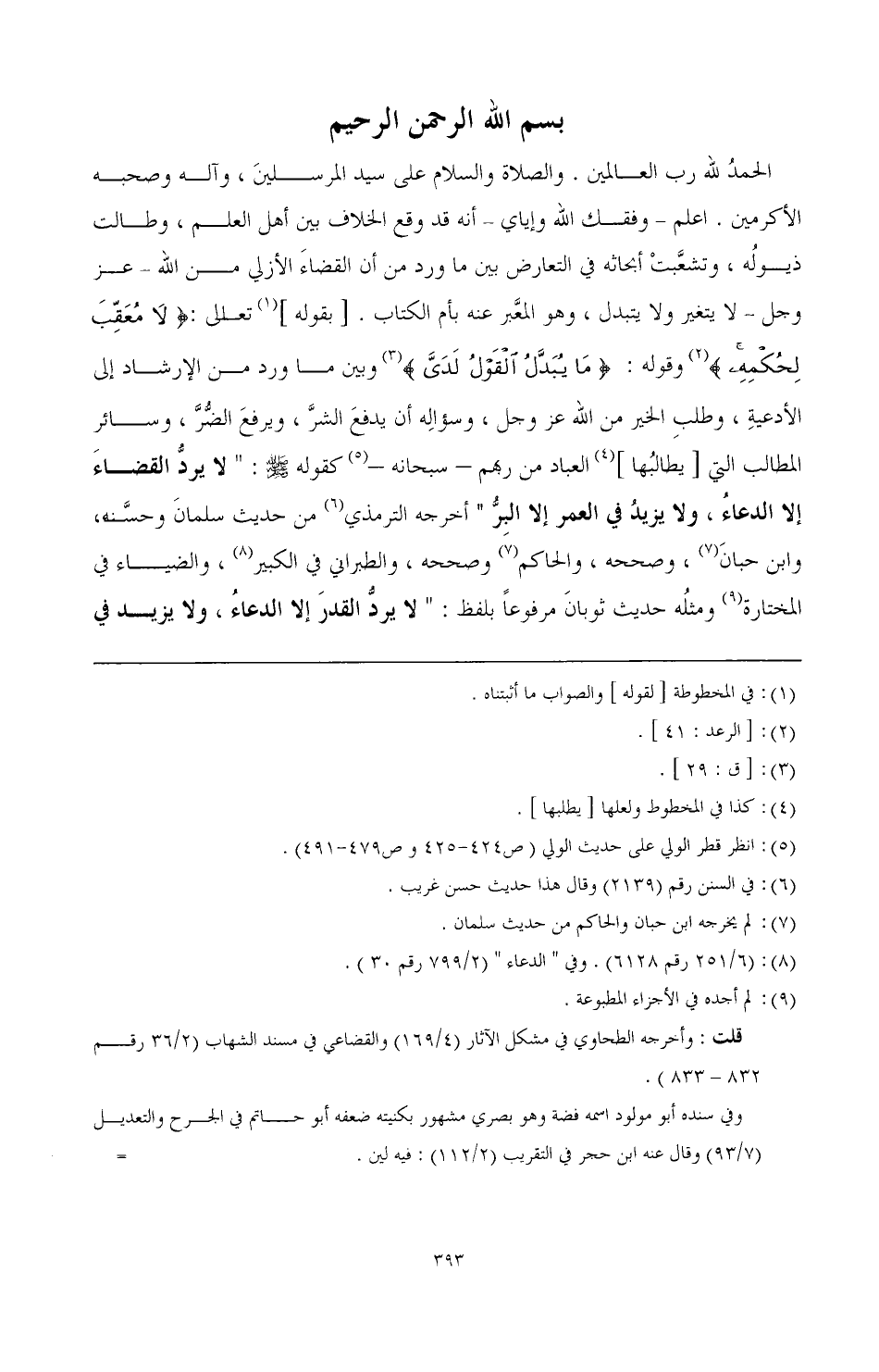 الحمد لله رب العالمين، والصلاة والسلام على سيد المرسلين، وآله وصحبه الأكرمين. اعلم -وفقك الله وإياي- أنه قد وقع الخلاف بين أهل العلم، وطالت ذيوله، وتشعبت أبحاثه في التعارض بين ما ورد من أن القضاء الأزلي من الله -عز وجل- لا يتغير ولا يتبدل، وهو المعبر عنه بأم الكتاب [بقوله] (¬1) تعالى:} لا معقب لحكمه {(¬2) وقوله:} ما يبدل القول لدي {(¬3) وبين ما ورد من الإرشاد إلى الأدعية، وطلب الخير من الله عز وجل، وسؤاله أن يدفع الشر، ويرفع الضر، وسائر المطالب التي [يطالبها] (¬4) العباد من ربهم -سبحانه- (¬5) كقوله صَلَّى اللهُ عَلَيْهِ وَسَلَّمَ: " لا يرد القضاء إلا الدعاء، ولا يزيد في العمر إلا البر " أخرجه الترمذي (¬6) من حديث سلمان وحسنه، وابن حبان (¬7)، وصححه، والحاكم (¬8) وصححه، والطبراني في الكبير (¬9)، والضياء في المختارة (¬10) ومثله حديث ثوبان مرفوعًا بلفظ: " لا يرد القدر إلا الدعاء، ولا يزيد في