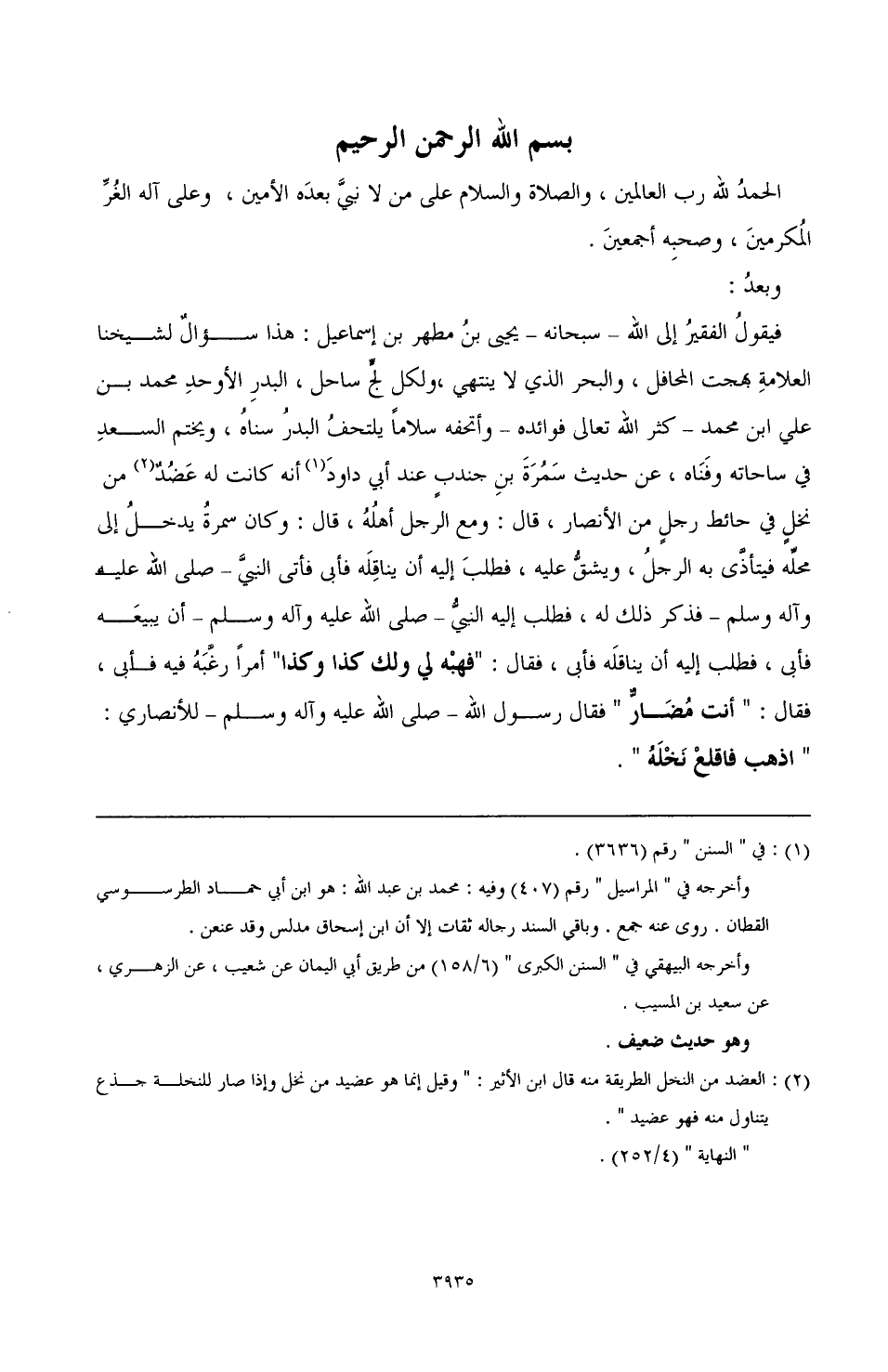 فيقولُ الفقيرُ إلى الله ـ سبحانه ـ يحيى بنُ مطهر بن إسماعيل: هذا سؤال لشيخنا العلامةِ بهجت المحافل، والبحر الذي لا ينتهي، ولكل لجٍّ ساحل، البدرِ الأوحد محمد بن علي بن محمد ـ كثر الله تعالى فوائده ـ وأتحفه سلامًا يلتحفُ البدرُ سناهُ، ويختم السعدِ في ساحاته وفَنَاه، عن حديث سَمُرَةَ بنِ جندبٍ عند أبي داودَ (¬1) أنه كانت له عَضُدٌ (¬2) من نخلٍ في حائط رجلٍ من الأنصار، قال: ومع الرجل أهلُهُ، قال: وكان سمرةُ يدخلُ إلى محلِّه فيتأذَّى به الرجلُ، ويشقُّ عليه، فطلبَ إليه أن يناقِلَه فأبى فأتى النبيَّ ـ صَلَّى اللهُ عَلَيْهِ وَآلِهِ وَسَلَّمَ ـ فذكر ذلك له، فطلب إليه النبيُّ ـ صَلَّى اللهُ عَلَيْهِ وَآلِهِ وَسَلَّمَ ـ أن يبيعَه فأبى، فطلب إليه أن يناقلَه فأبى، فقال: "فهبْه لي ولك كذا وكذا" أمرًا رغَّبَهُ فيه فأبى، فقال: "أنت مُضَارٌّ" فقال رسول الله ـ صَلَّى اللهُ عَلَيْهِ وَآلِهِ وَسَلَّمَ ـ للأنصاري: "اذهب فاقلعْ نَخْلَهُ".