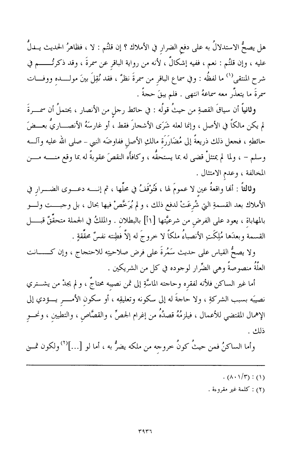 ولا يصحُّ القياس على حديث سَمُرةَ على فرض صلاحيتِه للاحتجاج، وإن كانت العلَّةُ منصوصةً وهي الضِّرار لوجوده في كل من الشريكين.