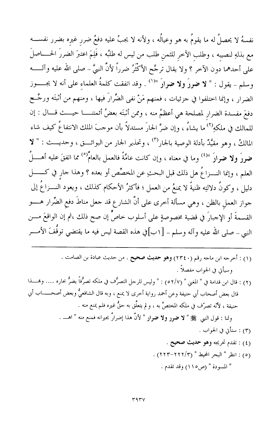 (¬2) قال ابن قدامة في "المغني" (7/ 52): "وليس للرجل التصرُّف في ملكه تصرُّفًا يضرُّ بجاره ... وبهذا قال بعض أصحاب أبي حنيفة وعن أحمد رواية أخرى لا يمنع، وبه قال الشافعيُّ وبعض أصحاب أبي حنيفة، لأنّه تصرّف في ملكه المختصِّ به، ولم يتعلَّق به حقُّ غيره فلم يمنع منه.