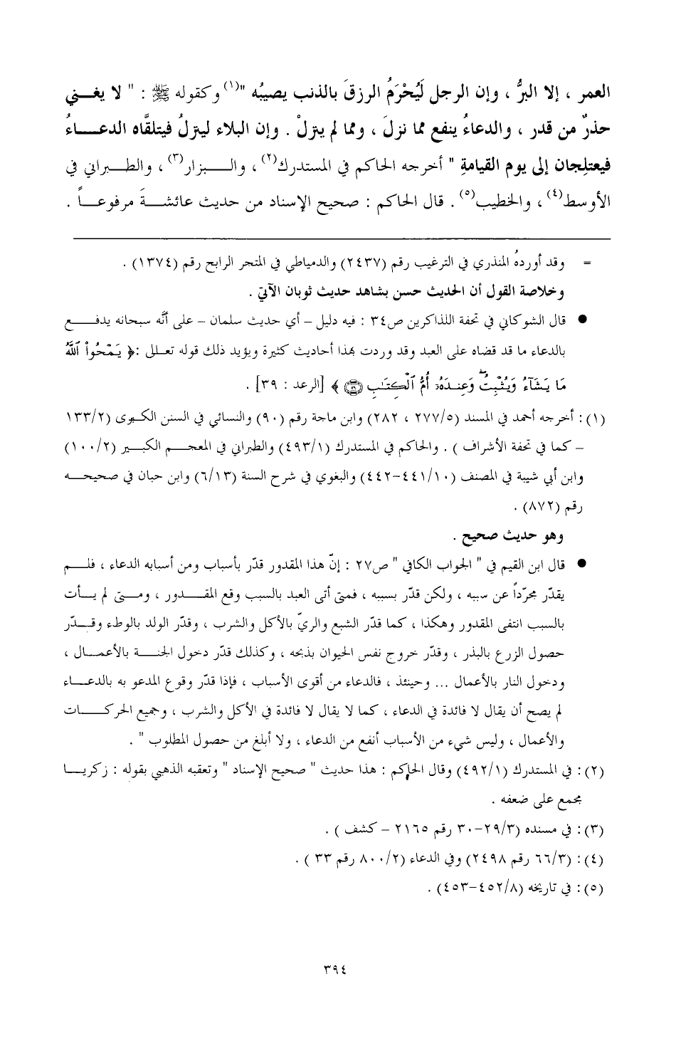 العمر إلا البر، وإن الرجل ليُحرم الرزق بالذنب يصيبه" (¬1) وكقوله: " لا يغني حذر من قدر، والدعاء ينفع مما نزل، ومما لم ينزل، وإن البلاء لينزل فيتلقاه الدعاء فيعتلجان إلى يوم القيامة " أخرجه الحاكم في المستدرك (¬2)، والبزار (¬3)، والطبراني في الأوسط (¬4)، والخطيب (¬5) قال الحاكم: صحيح الإسناد من حديث عائشة مرفوعًا.