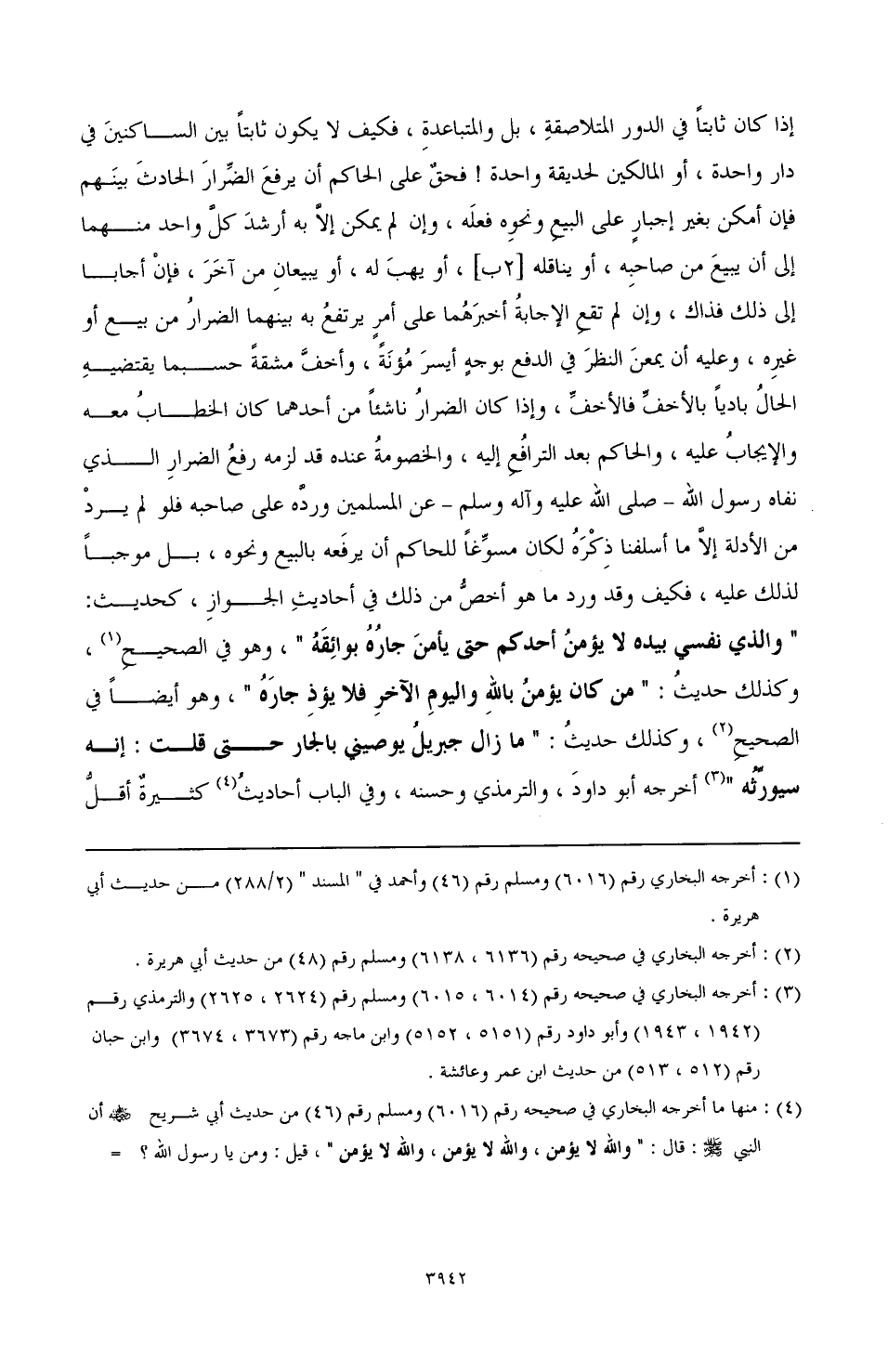 إذا كان ثابتًا في الدور المتلاصقةِ، بل والمتباعدةِ، فكيف لا يكون ثابتًا بين الساكنينَ في دار واحدة، أو المالكين لحديقة واحدة! فحقٌ على الحاكم أن يرفعَ الضِّرار الحادث بينَهم فإن أمكن بغير إجبارٍ على البيعِ ونحوِه فعلَه، وغن لم يمكن إلاَّ به أرشدَ كلَّ واحد منهما إلى أن يبيعَ من صاحبِه، أو يناقله [2ب]، أو يهبَ له، أو يبيعانِ من آخر، فإنْ أجابا إلى ذلك فذاك، وإن لم تقع الإجابةُ أخبرَهما على أمر يرتفع به بينهما الضرار من بيع أو غيره، وعليه أن يمعن النظر في الدفع بوجهٍ أيسر مُؤنة، وأخف مشقة حسبما يقتضيه الحالُ باديًا بالأخفِّ، وإذا كان الضرارُ ناشئًا من أحدهما كان الخطابُ معه والإيجابُ عليه، والحاكم بعد الترافُعِ إليه، والخصومةُ عنده قد لزمه رفعُ الضرارِ الذي نفاه رسول الله ـ صَلَّى اللهُ عَلَيْهِ وَآلِهِ وَسَلَّمَ ـ عن المسلمين وردَّه على صاحبه فلو لم يرد من الأدلة إلاَ ما أسلفنا ذِكْرَهُ لكان مسوِّغً للحاكم أن يرفَعه بالبيع ونحوه، بل موجبًا لذلك عليه، فكيف وقد ورد ما هو أخصُّ من ذلك في أحاديثِ الجوازِ، كحديث: "والذي نفسي بيده لا يؤمنُ أحدكم حتى يأمنَ جارُهُ بوائِقَهُ"، وهو في الصحيح (¬1)، وكذلك حديثُ: "من كان يؤمنُ باللهِ واليومِ الآخر فلا يؤذِ جارَهُ"، وهو أيضًا في الصحيح (¬2)، وكذلك حديثُ: "ما زال جبريلُ يوصيني بالجار حتى قلت: إنه سيورِّثُه" (¬3) أخرجه أبو داود، والترمذي وحسنه، وفي الباب أحاديثُ (¬4) كثيرةٌ أقلُّ