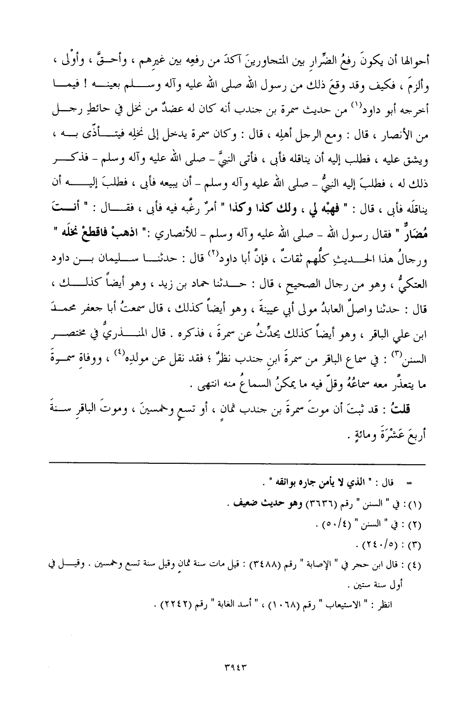 أحوالها أن يكون رفعُ الضِّرارِ بين المتجاورينَ آكدَ من رفعِه بين غيرِهم، وأحقَّ، وأوْلى، وألزمَ، فكيف وقد وقعَ ذلك من رسول الله صَلَّى اللهُ عَلَيْهِ وَآلِهِ وَسَلَّمَ بعينه! فيما أخرجه أبو داود (¬1) من حديث سمرة بن جندب أنه كان له عضدٌ من نخل في حائطِ رجل من الأنصار، قال: ومع الرجل أهلِه، قال: وكان سمرة يدخل إلى نخلِه فيتأذى به، ويشق عليه، فطلب إليه أن يناقله فأبى، فأتى النبيَّ ـ صَلَّى اللهُ عَلَيْهِ وَآلِهِ وَسَلَّمَ ـ فذكر ذلك له، فطلبَ النبيُّ ـ صَلَّى اللهُ عَلَيْهِ وَآلِهِ وَسَلَّمَ ـ أن يبيعه فأبى، فطلبَ إليه أن يناقلَه فأبى، قال: "فهبْه لي، ولك كذا وكذا" أمرٌ رغَّبه فيه فأبى، فقال: أنتَ مُضَارٌّ" فقال رسول الله ـ صَلَّى اللهُ عَلَيْهِ وَآلِهِ وَسَلَّمَ ـ للأنصاري: اذهبْ فاقطعْ نخلَه" ورجالُ هذا الحديثِ كلُّهم ثقاتٌ، فإنَّ أبا داود (¬2) قال: حدثنا سليمان بن داود العتكيُّ، وهو من رجال الصحيحِ، قال: حدثنا حماد بن زيد، وهو أيضًا كذلك، قال: حدثنا واصلٌ العابدُ مولى أبي عيينةَ، وهو أيضًأ كذلك، قال سمعتُ أبا جعفر محمدَ بن علي الباقر، وهو أيضًا كذلك يحدِّثُ عن سمرةَ، فذكره. قال المنذريُّ في مختصر السنن (¬3): في سماع الباقر من سمرةَ بنِ جندب نظرٌ؛ فقد نقل عن مولدِه (¬4)، ووفاةِ سمرةَ ما يتعذَّر معه سماعُهُ وقلّ فيه ما يمكنُ السماعُ منه انتهى.
