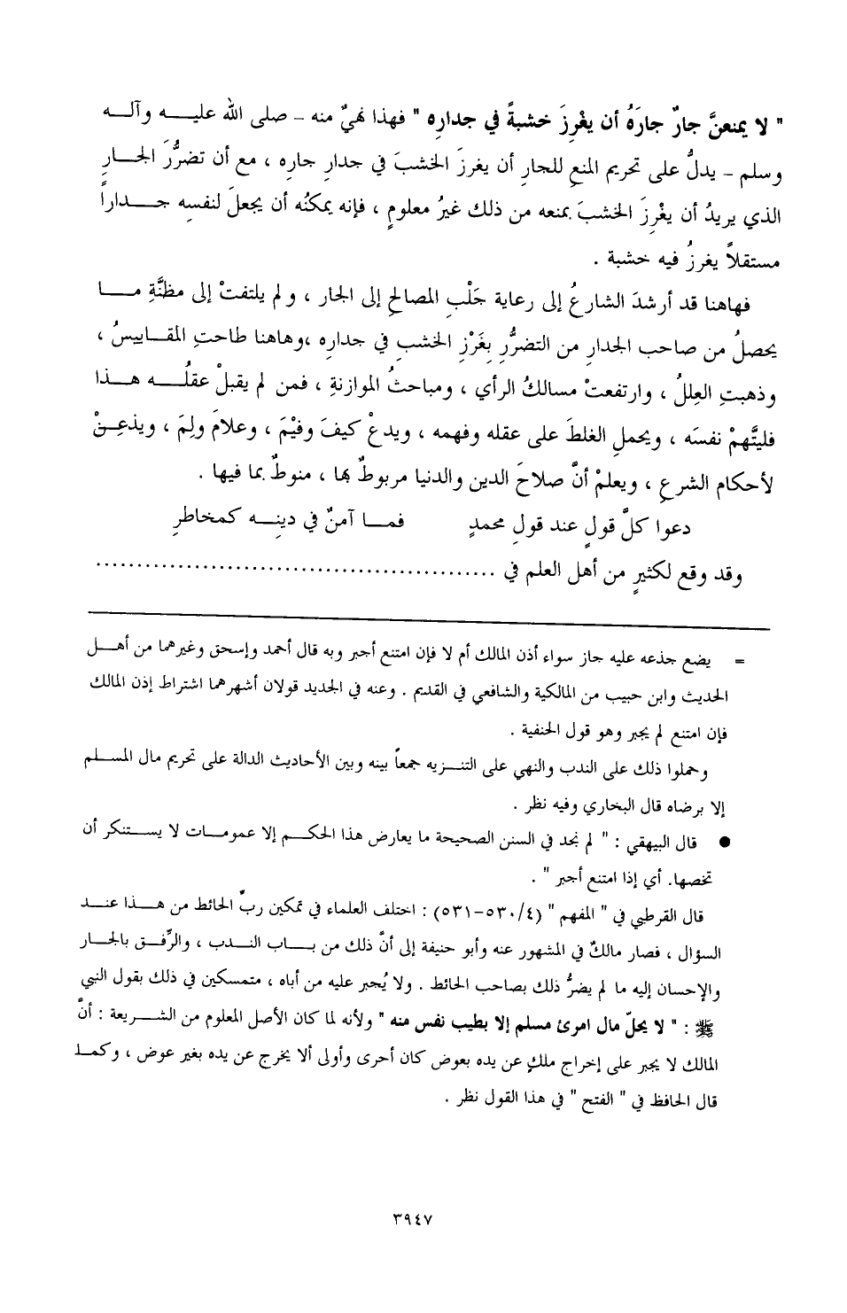 "لا يمنعنَّ جارٌ جارَهُ أن يغْرِزَ خشبةً في جدارِه" فهذا نهيٌ منه ـ صَلَّى اللهُ عَلَيْهِ وَآلِهِ وَسَلَّمَ ـ يدلُّ على تحريم المنعِ للجارِ أن يغرزَ الخشبَ في جدارِ جارِه، مع أن تضرُّرَ الجار الذي يريد أن يغْرِزَ الخشبَ بمنعه من ذلك غيرُ معلومٍ، فإنه يمكنُه أن يجعل لنفسه جدارًا مستقلاً يغرزُ فيه خشبة.