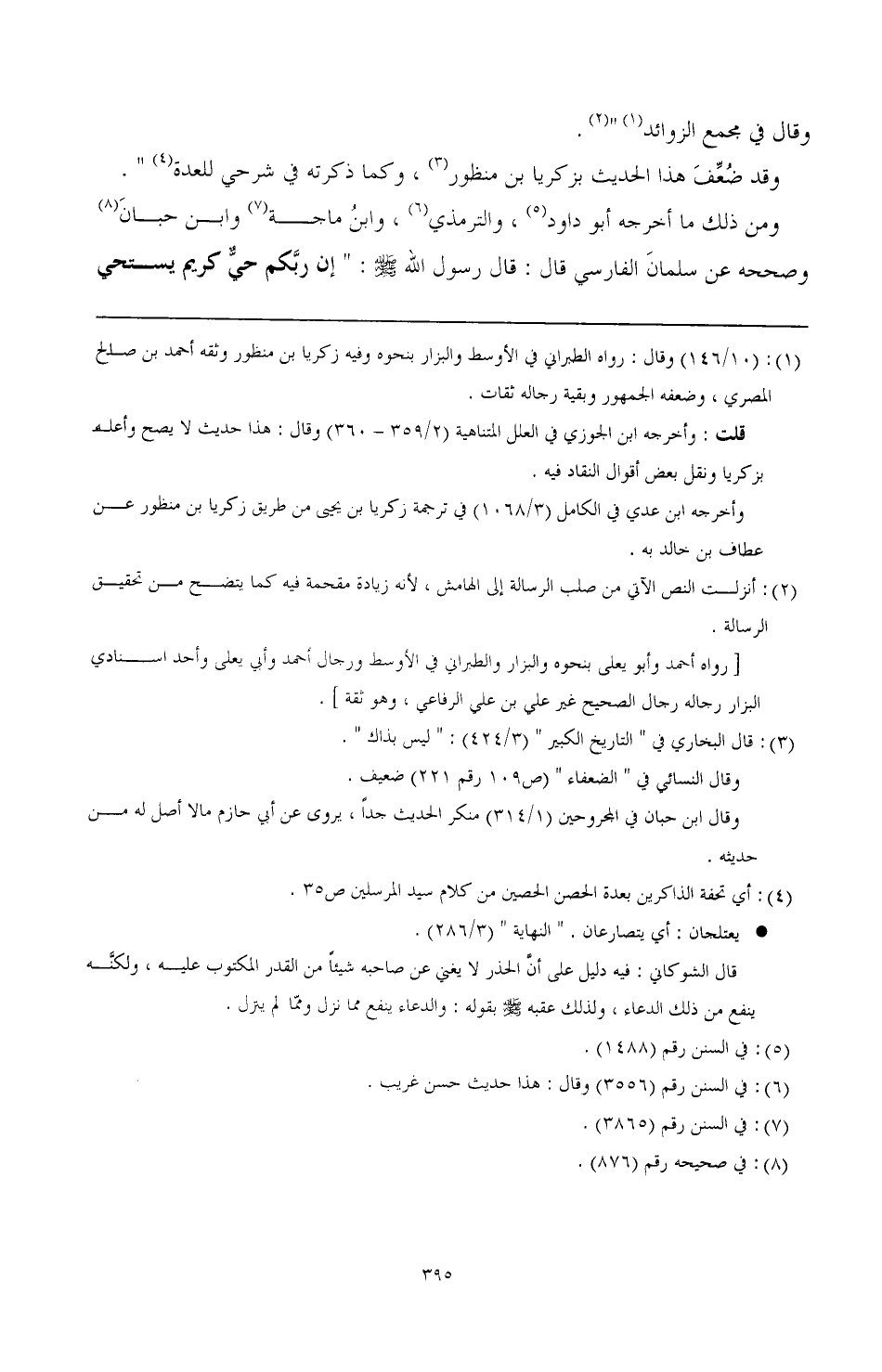 ومن ذلك ما أخرجه أبو داود (¬5) والترمذي (¬6)، وابن ماجه (¬7) وابن حبان (¬8) وصححه عن سلمان الفارسي قال: قال رسول الله صَلَّى اللهُ عَلَيْهِ وَسَلَّمَ: " إن ربكم حيي كريم يستحي