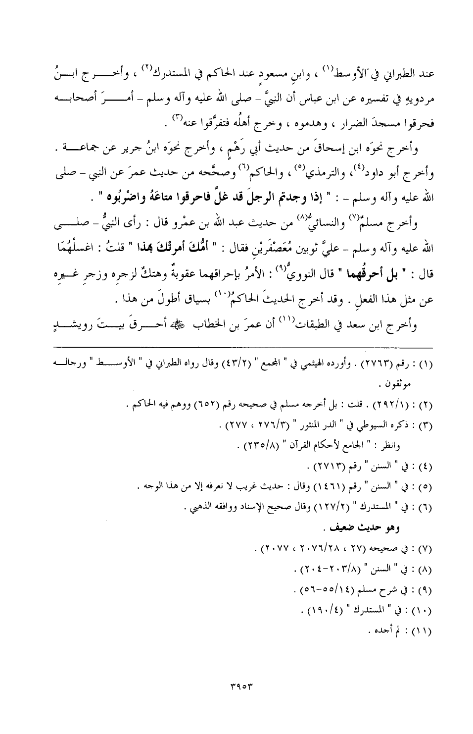 عند الطبراني في الأوسط (¬1)، وابن مسعودٍ عند الحاكم في المستدرك (¬2)، وأخرج ابنُ مردويهِ في تفسيره عن ابن عباس أن النبي ـ صَلَّى اللهُ عَلَيْهِ وَآلِهِ وَسَلَّمَ ـ أمرَ أصحابه فحرقوا مسجد الضرار، وهدموه، وخرج أهلُه فتفرَّقوا عنه (¬3). وأخرج نحوَه ابن إسحاقَ من حديث أبي رَهْمٍ، وأخرج نحوَه ابنُ جرير عن جماعة. وأخرج أبو داود (¬4)، والترمذي (¬5)، والحاكم (¬6) وصحَّحه من حديث عمرَ عن النبي ـ صَلَّى اللهُ عَلَيْهِ وَآلِهِ وَسَلَّمَ ـ: "إذا وجدتم الرجلَ قد غلَّ فأحرقوا متاعَهُ واضْربُوه".
