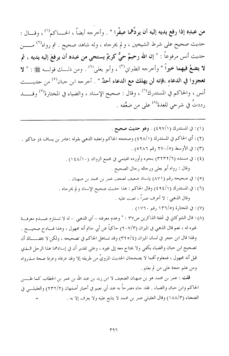 (¬8) قال الشوكاني في تحفة الذاكرين ص 37: " وعدم معرفته -أي الذهبي- له لا تستلزم عدم معرفة غيره له، نعم قال الذهبي في الميزان (3/ 207) حاكيا عن أبي حاتم أنه مجهول، وهذا قادح صحيح. ولهذا قال ابن حجر في لسان الميزان (4/ 325) وقد تساهل الحاكم في تصحيحه، ولكن لا يخفاك أن تصحيح ابن حبان والضياء يكفي ولا يحتاج معه إلى غيره، وعلى تقدير أن في إسنادهما هذا الرجل الذي قيل: إنه مجهول، فمعلوم أنهما لا يصححان الحديث المروي من طريقه إلا وقد عرفاه وعرفا صحة ما رواه، ومن علم حجة على من لم يعلم.