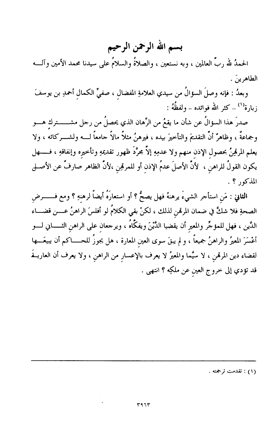 وبعدُ: فإنه وصلَ السؤالُ من سيدي العلامة المفضال، صفيّ الكمال أحمد بن يوسف زيارة (¬1) ـ كثر الله فوائده ـ ولفظُهُ: