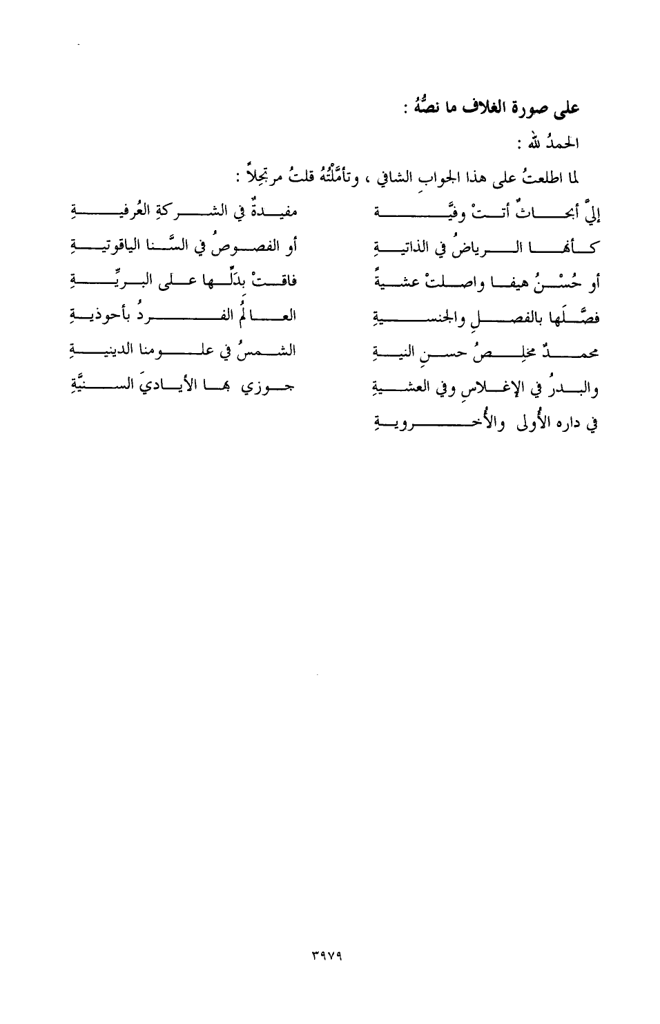 لما اطلعتُ على هذا الجوابِ الشافي، وتأمَّلْتُهُ قلتُ مرتجِلاً:
