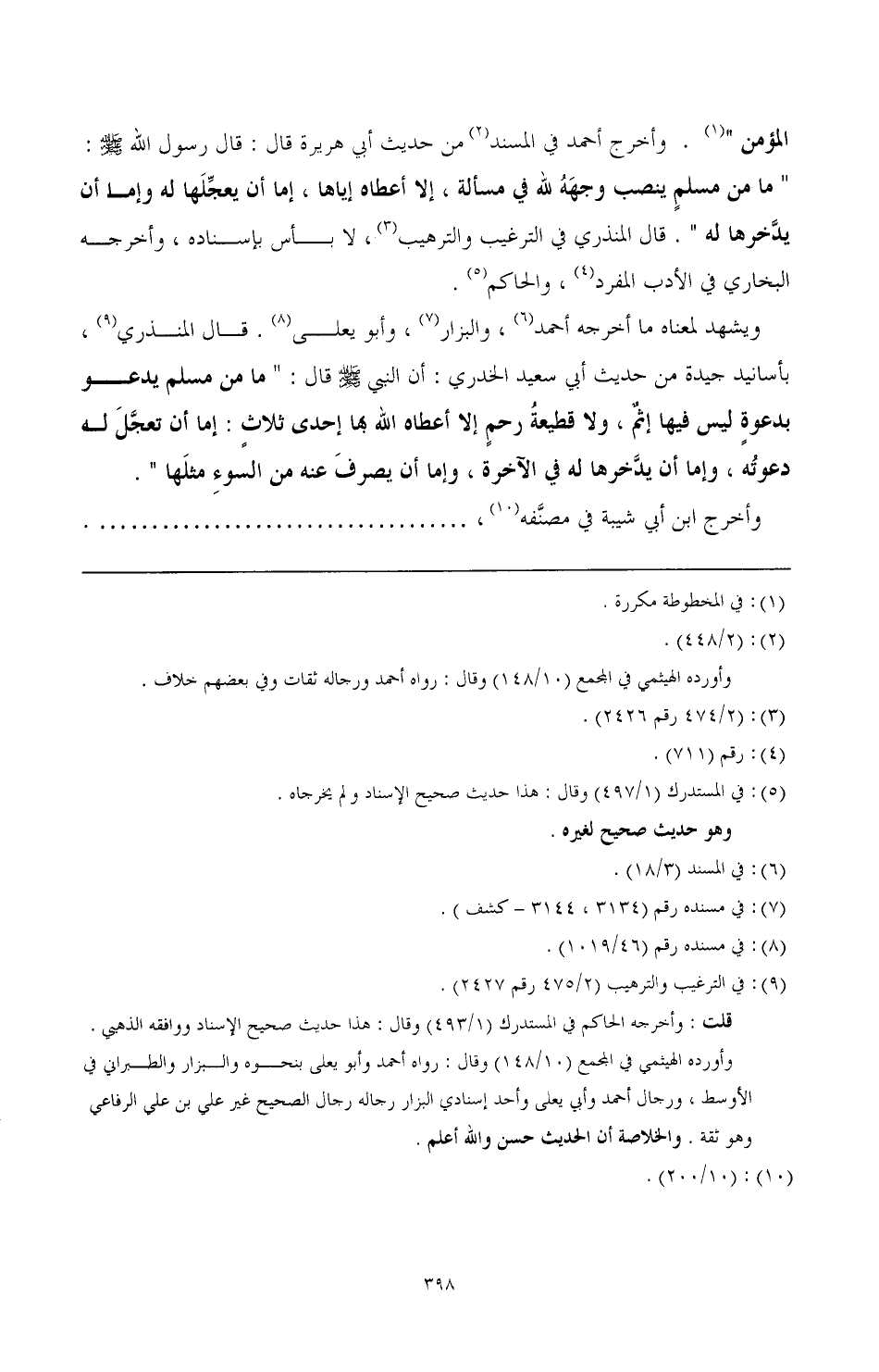 المؤمن" (¬1). وأخرج أحمد في المسند (¬2) من حديث أبي هريرة قال: قال رسول الله صَلَّى اللهُ عَلَيْهِ وَسَلَّمَ: " ما من مسلم ينصب وجهه لله في مسألة، إلا أعطاه إياها، إما أن يعجلها له، وإما أن يدخرها له ". قال المنذري في الترغيب والترهيب (¬3)، لا بأس بإسناده، وأخرجه البخاري في الأدب المفرد (¬4)، والحاكم (¬5).