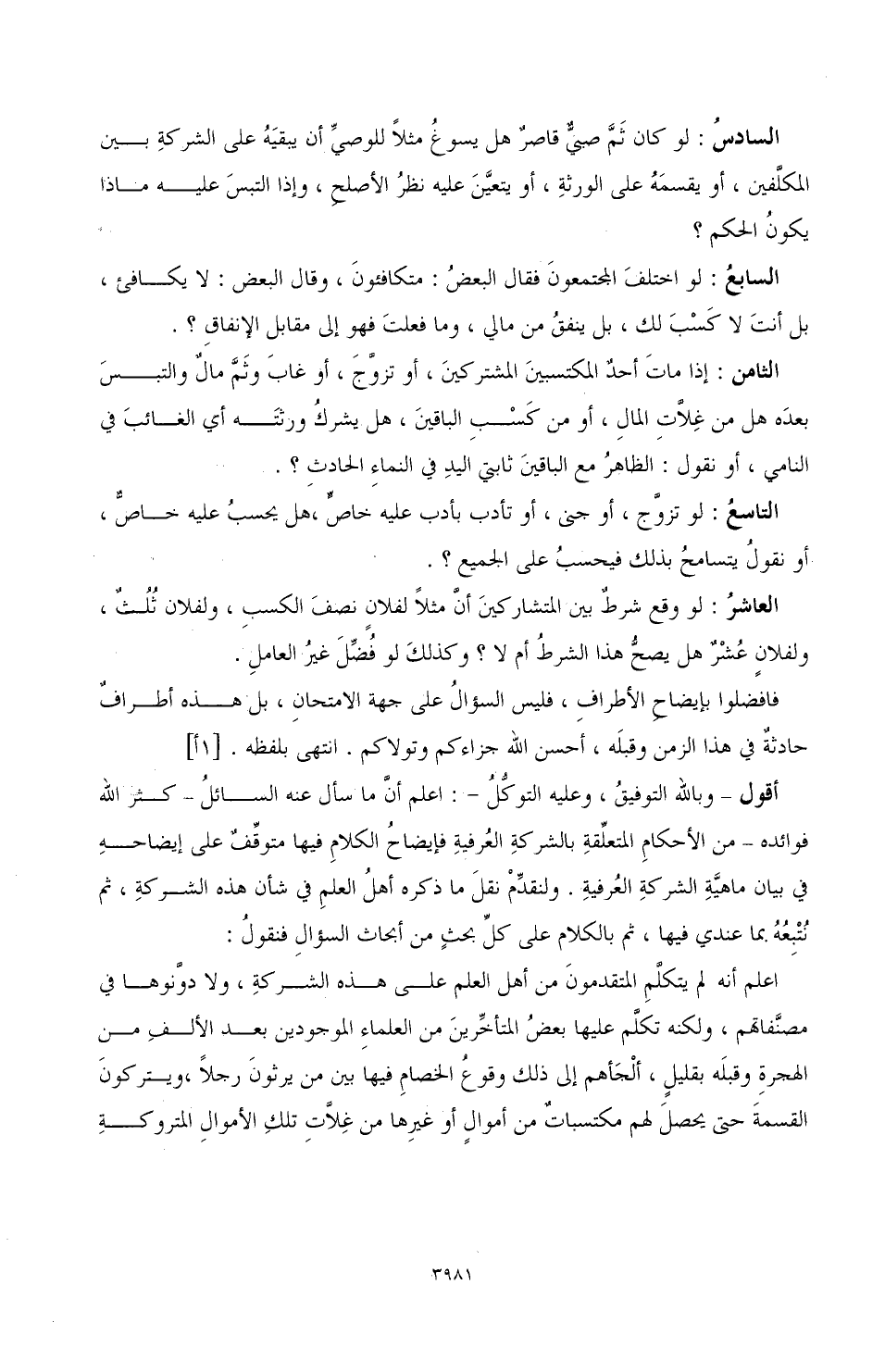 أقول ـ وبالله التوفيق، وعليه التوكُّل ـ: اعلم أنَّ ما سأل عنه السائلُ ـ كثر الله فوائده ـ من الأحكامِ المتعلِّقة بالشركةِ العُرفية فإيضاحُ الكلامِ فيها متوقِّفٌ على إيضاحِه في بيان ماهيَّة الشركة العُرفية. ولنقدِّم نقل ما ذكره أهلُ العلم في شأن الشركة، ثم نُتْبِعُهُ بما عندي فيها، ثم بالكلام على كلِّ بحثٍ من أبحاث السؤال فنقولُ: