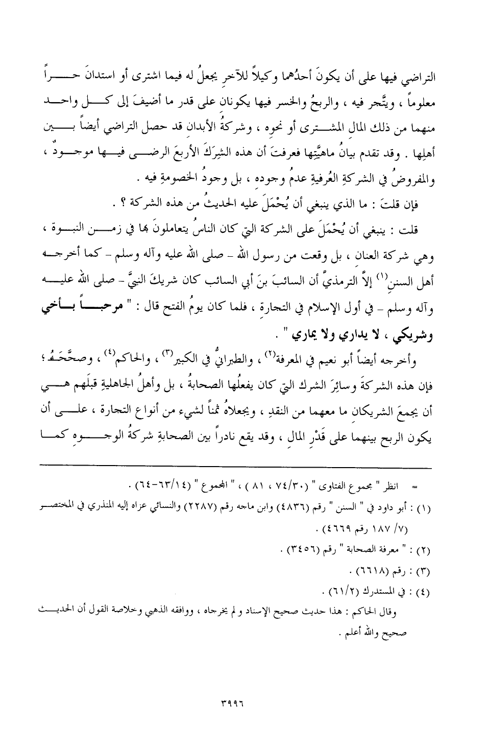 وأخرجه أيضًا أبو نعيم في المعرفة (¬2)، والطبرانيُّ في الكبير (¬3)، والحاكم (¬4)، وصحَّحَهُ؛ فإن هذه الشركة وسائر الشرك التي كان يفعلُها الصحابة، بل وأهل الجاهلية قبلهم هي أن يجمع الشريكان ما معهما من النقد، ويجعلاهُ ثمنًا لشيء من أنواع التجارة، على أن يكون الربح بينهما على قَدْرِ المالِ، وقد يقع نادرًا بين الصحابةِ شركةُ الوجوهِ كما