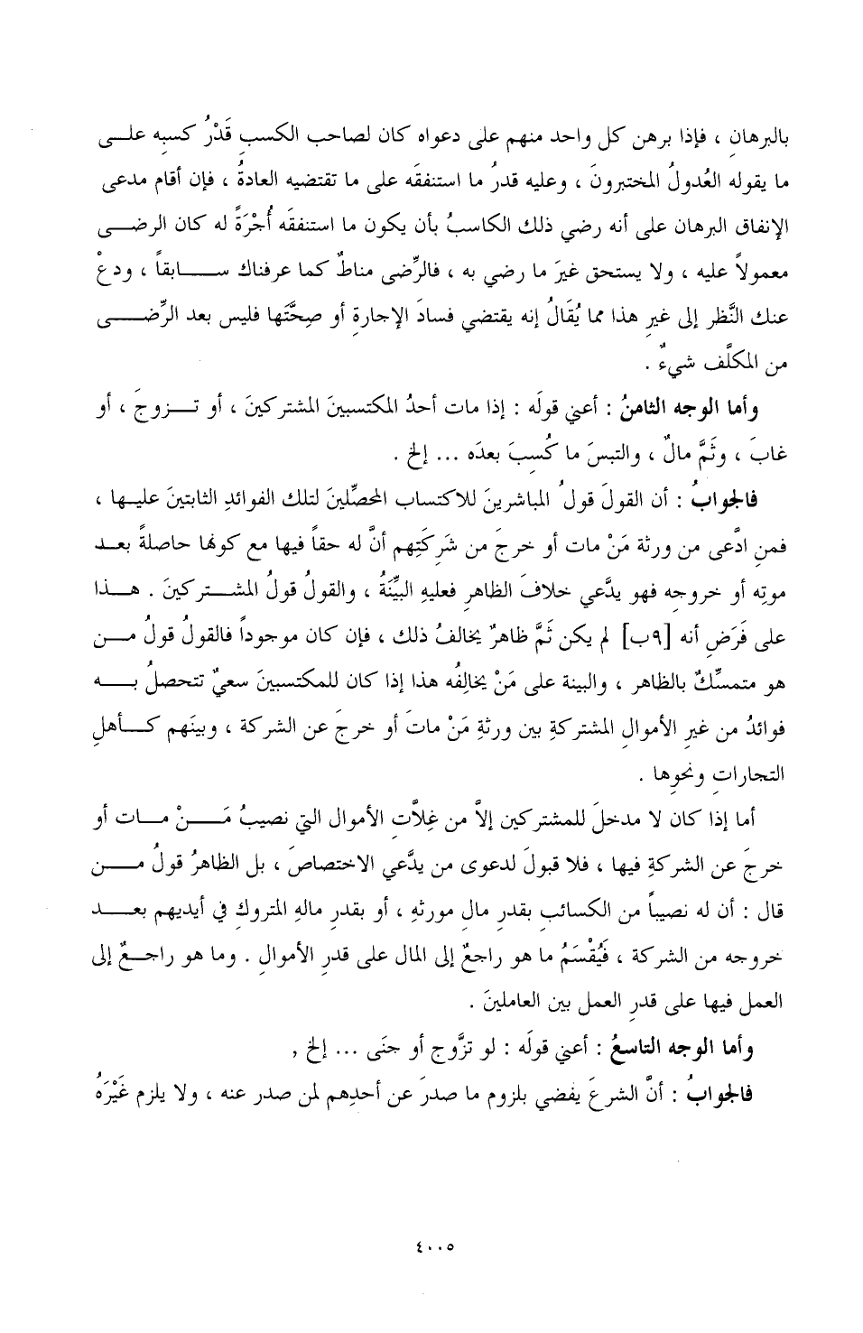 فالجوابُ: أن القولَ قولُ المباشرينَ للاكتساب المحصِّلينَ لتلك الفوائدِ الثابتينَ عليها، فمنِ ادَّعى من ورثة مَنْ مات أو خرجَ من شَرِكَتِهم أنَّ له حقًّا فيها مع كونها حاصلةً بعد موتِه أو خروجِه فهو يدَّعي خلاف الظاهر فعليه البيِّنة، والقول قول المشتركين. هذا على فَرَضِ أنه [9ب] لم يكن ثَمَّ ظاهرٌ يخالفُ ذلك، فإن كان موجودًا فالقولُ قولُ من هو مستمسك بالظاهر، والبينة على مَنْ يخالِفُه هذا إذا كان للمتسبينَ سعيٌ تتحصل به فوائده من غير الأموال المشتركة بين ورثة مَنْ ماتَ أو خرجَ عن الشركة، وبينَهم كأهلِ التجاراتِ ونحوِها.