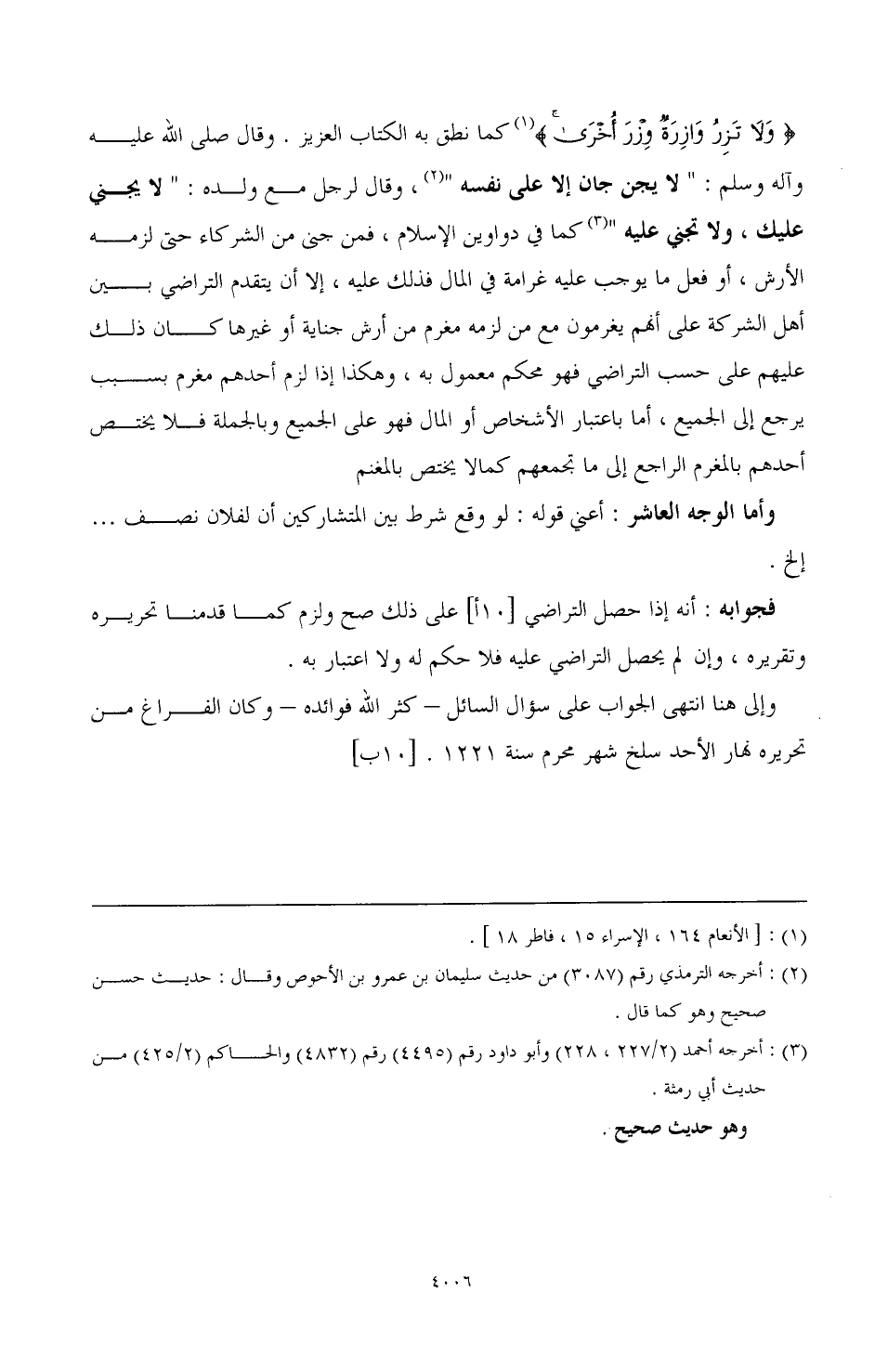 وإلى هنا انتهى الجواب على سؤال السائل ـ كثر الله فوائده ـ وكان الفراغ من تحريره نهار الأحد سلخ شهر محرم سنة 1221. [10ب]
