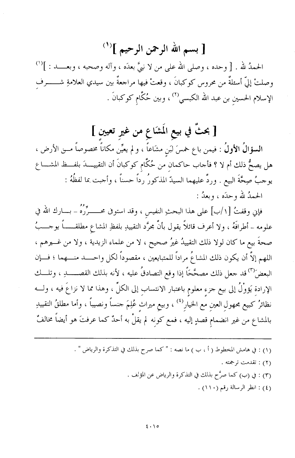 السؤالُ الأولُ: فيمن باع خمسَ لَبنٍ مشاعًا، ولم يعيِّن مكانًا مخصوصًا من الأرض، هل يصحُّ ذلك أم لا؟ فأجاب حاكمان من حُكَّامِ كوكبان أن التقييدَ بلفظ المشاع يوجبُ صِحَّةَ البيع. وردَّ عليهما السيدّ المذكورُ ردًا حسنًا، وأجبت بما لفظُهُ: