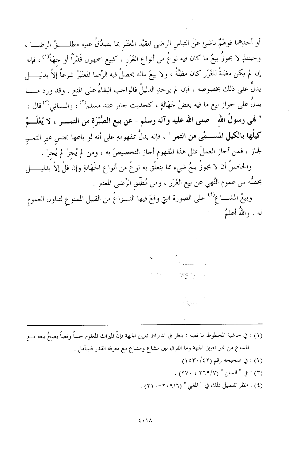 (¬1) في حاشية المخطوط ما نصه: ينظر في اشتراط تعيين الجهة فإنَّ الميراث المعلوم حسًا ونصًا يصحُّ بيعه مع المشاع من غير تعيين الجهة وما الفرق بين مشاع ومشاع مع معرفة القدر فليتأمل.