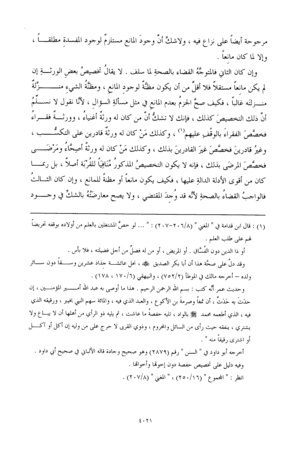 وإن كان الثاني فالمتوجَّهُ القضاء بالصحةِ لما سلف. لا يقالُ تخصيصُ بعضِ الورثةِ إن لم يكن مانعًا مستقلاً فلا أقلَّ من أن يكون مظنَّةً لوجودِ المانعِ، ومظنَّةُ الشيءِ منزَّلةٌ منزلتَه غالبًا، فكيف صحَّ الجزمُ بعدم المانع في مثل مسألة السؤال، لأنَّا نقول لا نسلِّمُ أنّ ذلك التخصيص كذلك، فإنك لا تشكُّ أنّ من كان له ورثةٌ أغنياء، وورثة فقراء، فخصَّصَ الفقراء بالوقْفِ عليه (¬1)، وكذلك مَنْ كان له ورثةٌ قادرين على التكسُّب، وغيرُ قادرينَ فخصَّصَ غيرَ القادرينَ بذلك، وكذلك مَنْ كان له ورثةٌ أصِحَّاءُ ومَرْضَى فخصَّصَ المرضَى بذلك، فإنه لا يكون التخصيصُ المذكورُ مُنَافِيًا للقُرْبَة أصلاً، بل ربما كان من أقوى الأدلة الدالةِ عليها، فكيف يكون مانعًا أو مظنةً للمانع، وإن كان الثالثُ فالواجبُ القضاءُ بالصحة لأنّه قد وُجِدَ المقتضي، ولا يصح معارضَتُهُ بالشكِّ في وجود