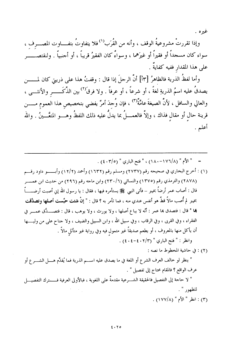 (¬1) أخرج البخاري في صحيحه رقم (2737) ومسلم رقم (1632) وأحمد (2/ 12) وأبو داود رقم (2878) والترمذي رقم (1375) والنسائي (6/ 230) وابن ماجه رقم (296) من حديث ابن عمر قال: أصاب عمر أرضًا بخيبر ـ فأتى النبي صَلَّى اللهُ عَلَيْهِ وَسَلَّمَ يستأمره فيها، فقال: يا رسول الله إني أصبت أرضًا بخيبر لم أُصب مالاً قطّ هو أنفس عندي منه، فما تأمر به؟ قال: "إنْ شئت حبَّست أصلها وتصدَّقت بها" قال: فتصدق بها عمر: أنّه لا يباع أصلها، ولا يورث، ولا يوهب، قال: فتصدّق عمر في الفقراء، وفي القربى، وفي الرقاب، وفي سبيل الله، وابن السبيل والضعيف، ولا جناحعلى من ولياه أن يأكل منها بالمعروف، أو يطعم صديقًا غير متمولٍ فيه وفي رواية غير متأثلٍ مالاً.