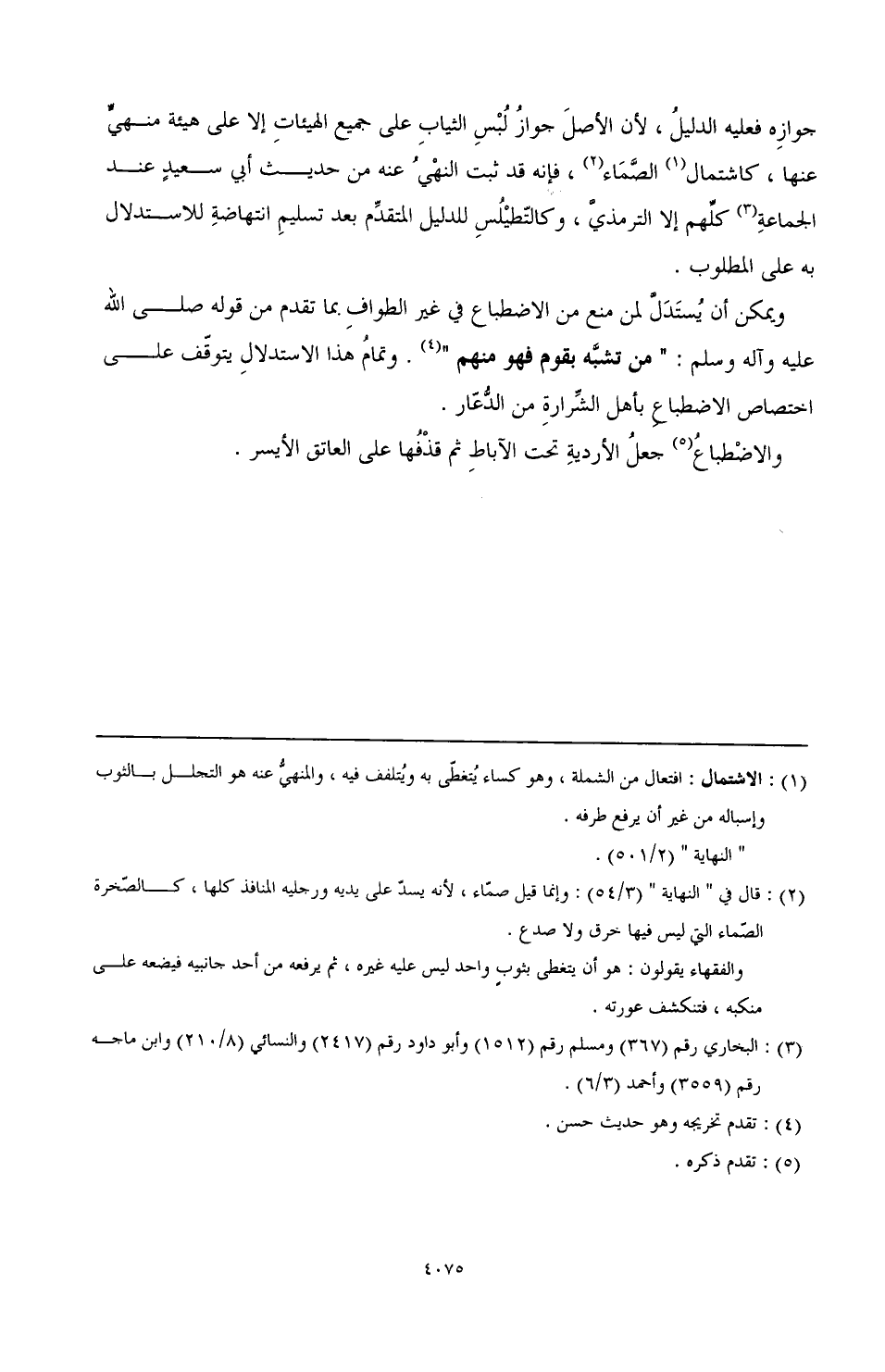 ويمكن أن يُستَدَلُّ لمن منع من الاضطباع في غير الطواف بما تقدم من قوله صَلَّى اللهُ عَلَيْهِ وَآلِهِ وَسَلَّمَ: "من تشبَّه بقوم فهو منهم" (¬4). وتمامُ هذا الاستدلالِ يتوقّف على اختصاص الاضطباع بأهل الشّرارة من الدُّعار.