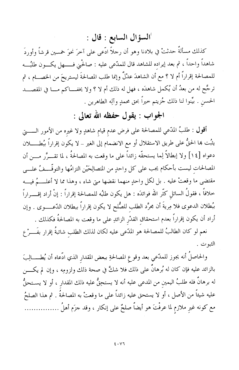 كذلك مسألةٌ حدثتْ في بلادنا وهو أن رجلاً ادّعى على آخرَ نحوَ خمسين قرشًا وأوردَ شاهدًا واحدًا، ثم بعد إيرادِه للشاهد قال للمدّعى عليه: صالحني فهل يكون طلبُه للمصالحة إقرارًا أم لا؟ مع أن الشاهدَ عْدلٌ وإنما طلب المصالحةَ ليستريحَ من الخصام، ثم ترجَّح له من بعدُ أن يُكمل شاهدَه، فهل له ذلك أم لا؟ ولا يخفاكم ما في المقصد الحسنِ. بيِّنوا لنا ذلك جُزيتم خيرًا بحق محمدٍ وآلِه الطاهرين.