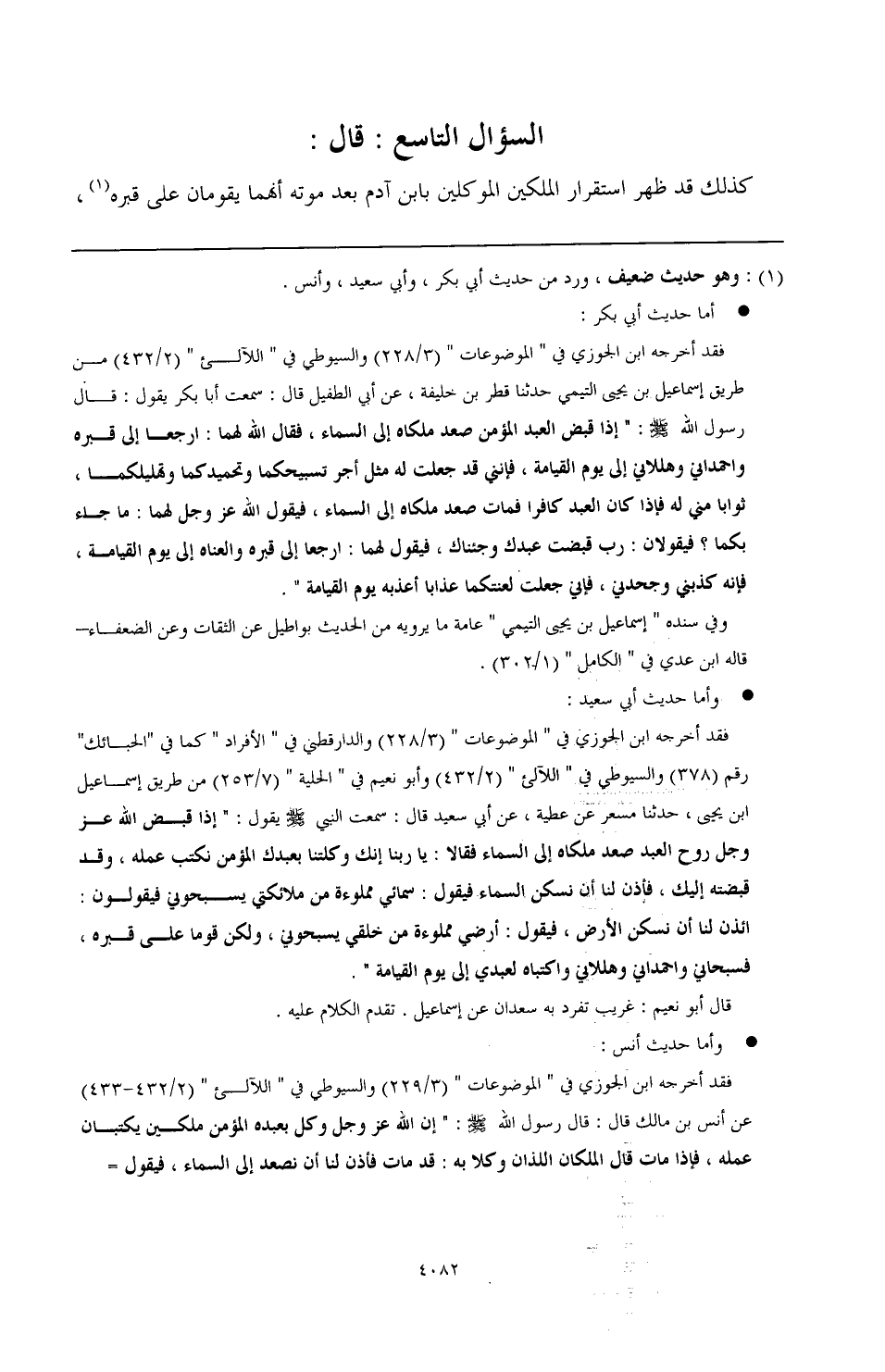 - وأما حديث أنس: فقد أخرجه ابن الجوزي في "الموضوعات" (3/ 229) والسيوطي في "اللآلئ" (2/ 432 - 433) عن أنس بن مالك قال: قال رسول الله صَلَّى اللهُ عَلَيْهِ وَسَلَّمَ: "إن الله عز وجل وكل بعبده المؤمن ملكين يكتبان عمله، فإذا مات قال الملكان اللذان وكلا به: قد مات فأذن لنا أن نصعد إلى السماء، فيقول الله عز وجل: سمائي مملوءة من ملائكتي يسبحوني، فيقولان: في الأرض، فيقول: أرضي مملوءة من خلقي يسبحوني، فيقولان: أين، فيقول: قوما عند قبر عبدي، فسبحاني واحمداني وكبراني وهللاني واكتبا ذلك لعبدي إلى يوم القيامة".