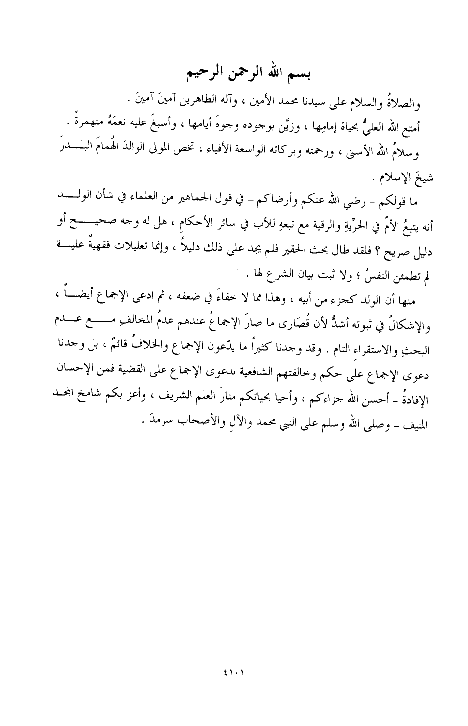 منها أن الولد كجزء من أبيه، وهذا مما لا خفاء في ضعفه، ثم ادعى الإجماع أيضًا، والإشكال في ثبوته أشدُّ لأن قُصارى ما صار الإجماعُ عندهم عدمُ المخالفِ مع عدم البحث والاستقراء التام. وقد وجدنا كثيرًا ما يدّعون الإجماعوالخلافُ قائمٌ، بل وجدنا دعوى الإجماع على حكم وخالفتهم الشافعية بدعوى الإجماع على القضية فمن الإحسان الإفادةُ ـ أحسن الله جزاءكم، وأحيا بحياتكم منار العلم الشريف، وأعز بكم شامخ المجد المنيف ـ وصلى الله على النبي محمد والآل والأصحاب سرمدَ.