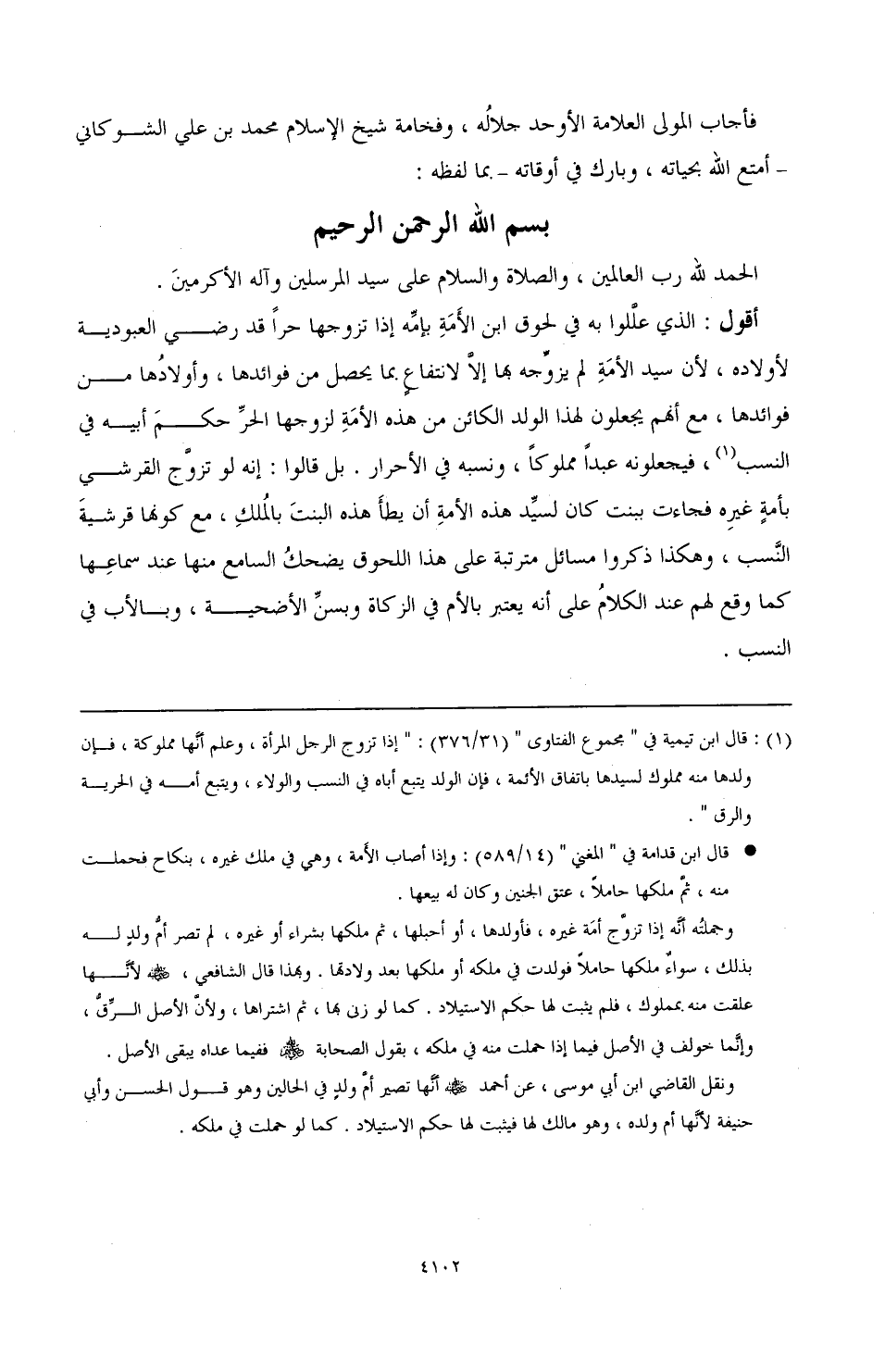 أقول: الذي علَّلوا به في لحوق ابن الأمة بأمه إذا تزوجها حرًّا قد رضي العبودية لأولاده، لأن سيد الأمة لم يزوِّجه بها إلاَّ لانتفاعٍ بما يحصل من فوائدها، وأولادُها من فوائدها، مع أنهم يجعلون لهذا الولد الكائن من هذه الأمة لزوجها الحرّ حكم أبيه في النسب (¬1)، فيجعلونه عبدًا مملوكًا، ونسبه في الأحرار. بل قالوا: إنه لو تزوَّج القرشي بأمة غيرِه فجاءت ببنت كان لسيِّد هذه الأمة أن يطأ هذه البنت بالمُلك، مع كونها قرشية النَّسب، وهكذا ذكروا مسائل مترتبة على هذا اللحوق يضحكُ السامع منها عند سماعها كما وقع لهم عند الكلام على أنه يعتبر بالأم في الزكاة وبسنِّ الأضحية، وبالأب في النسب.